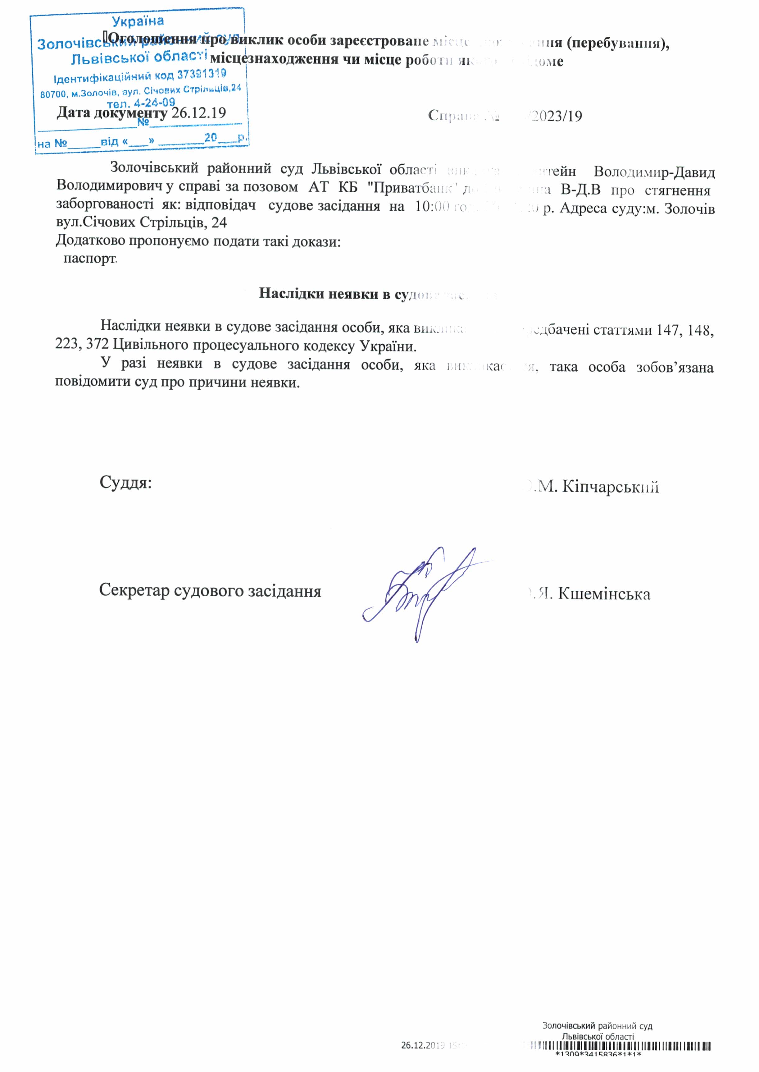 Оголошення про виклик в судове засідання Епштейн Володимир-Давид Володимирович відповідача по справі № 445/2023/19 на 20.01.2020 року о 10:00 год.