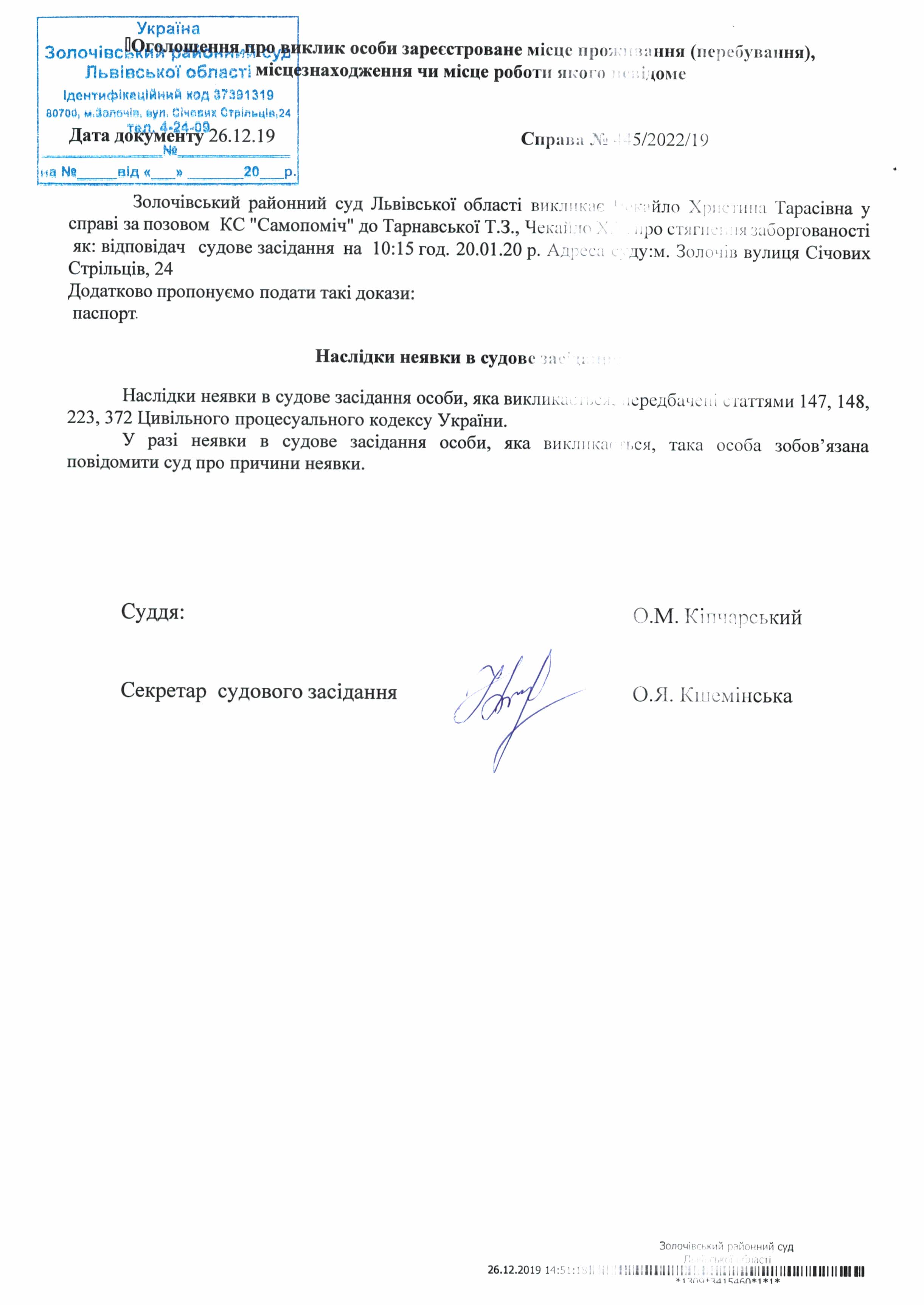 Оголошення про виклик в судове засідання Чекайло Х.Т. відповідача по справі № 445/2022/19 на 20.01.2020 року о 10:15 год.