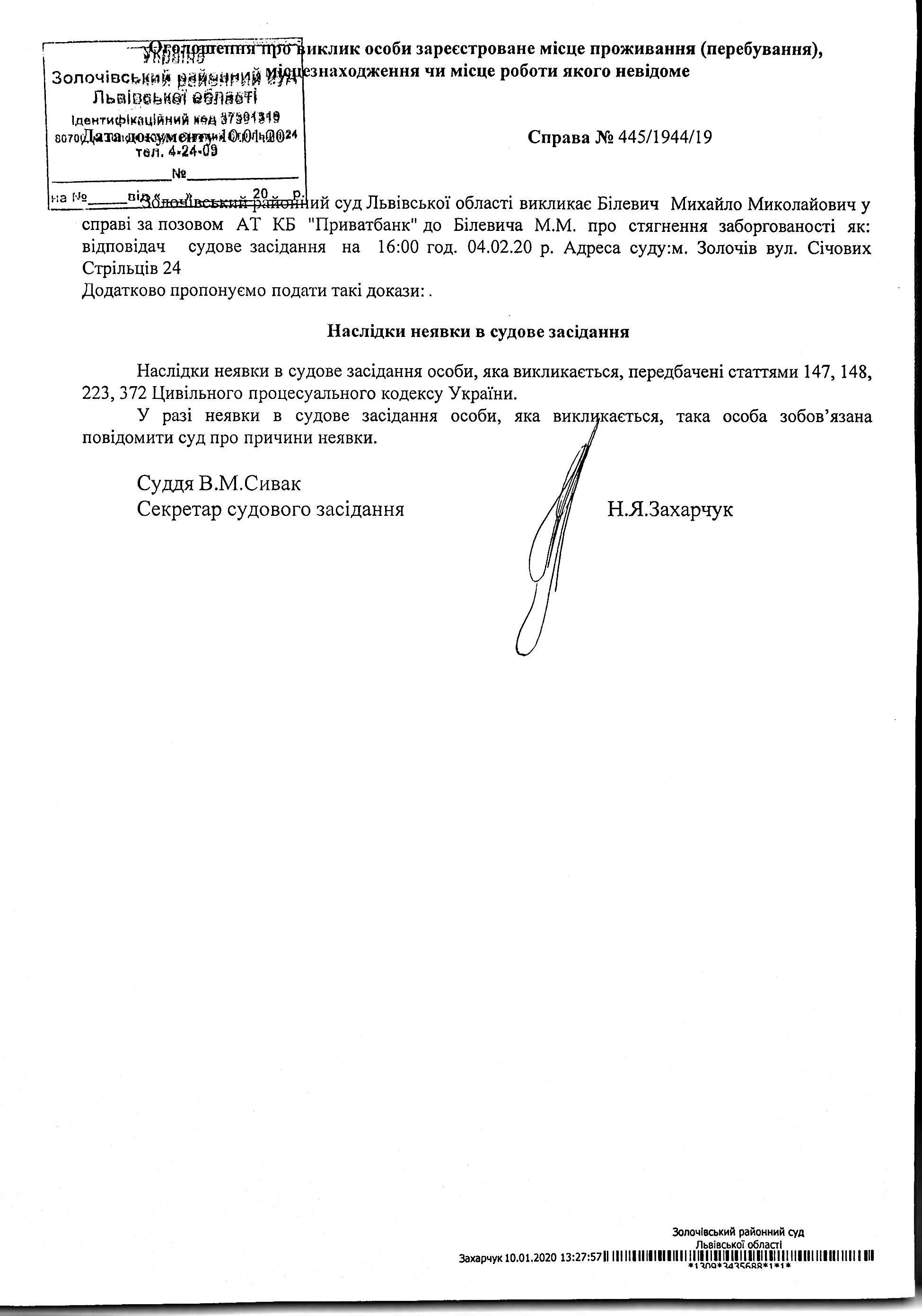 Оголошення про виклик в судове засідання Білевич М.М. відповідача по справі № 445/1944/19 на 04.02.2020 року о 16:00 год.