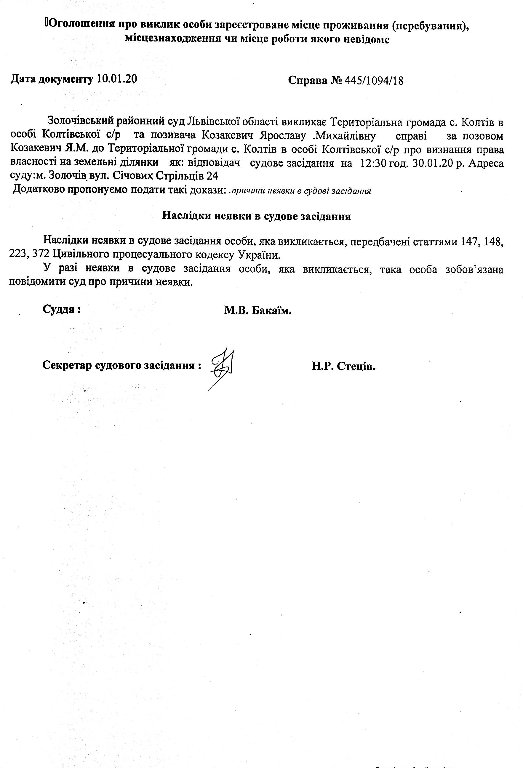 Оголошення про виклик в судове засідання Територіальну громаду с.Колтів в особі Колтівської с/р як відповідача та Козакевич Я.М. як позивача по справі № 445/1094/18 на 30.01.2020 року о 12:30 год.