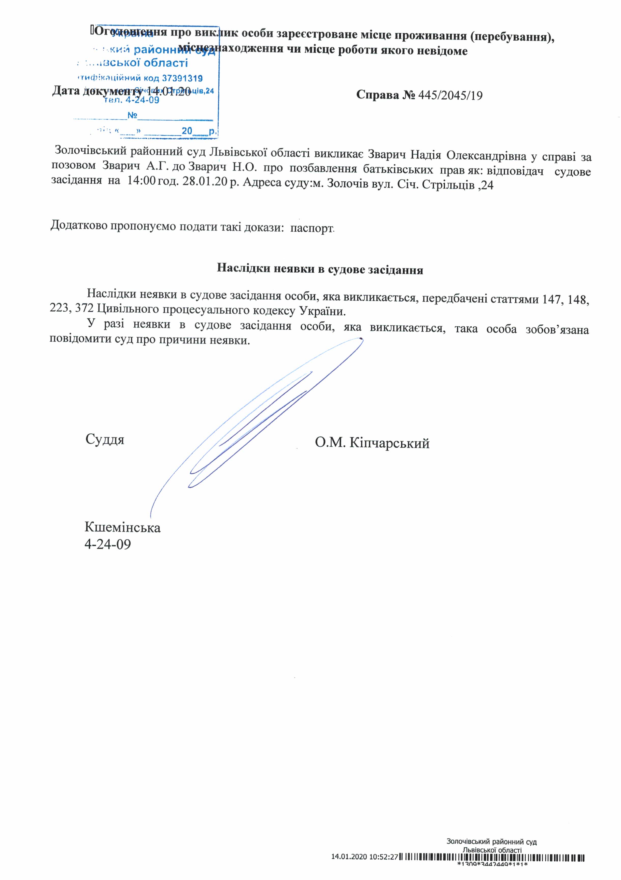 Оголошення про виклик в судове засідання Зварич Н.О. відповідача по справі № 445/2045/19 на 28.01.2020 року о 14:00 год.