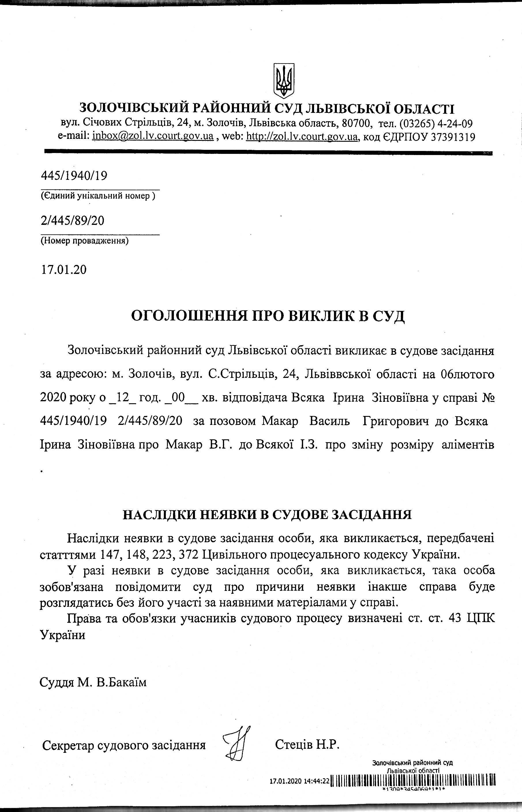 Оголошення про виклик в судове засідання Всяку І.З. відповідача по справі № 445/1940/19 на 06.02.2020 року о 12:00 год.