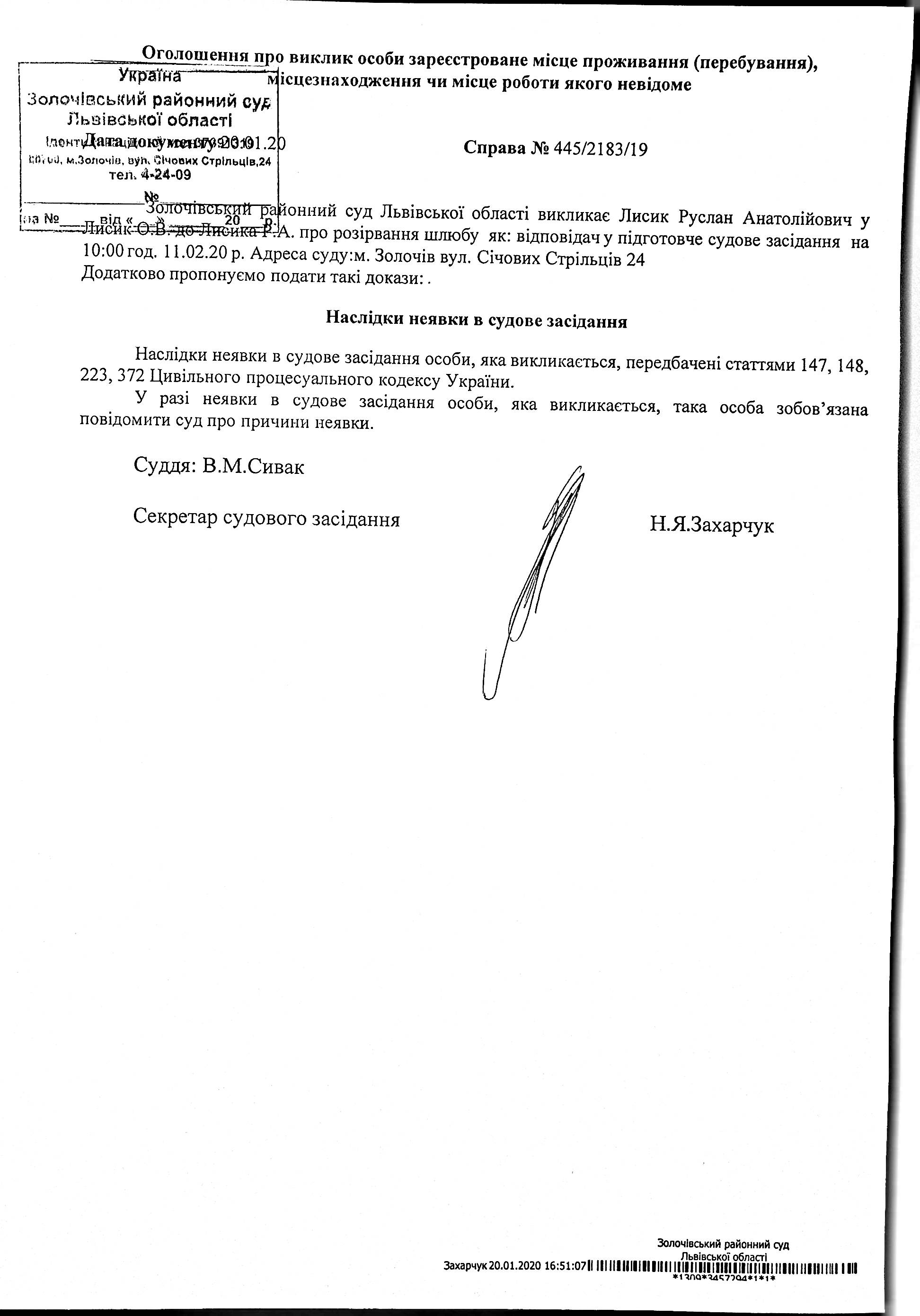 Оголошення про виклик в судове засідання Лисик Р.А. відповідача по справі № 445/2183/19 на 11.02.2020 року о 10:00 год.