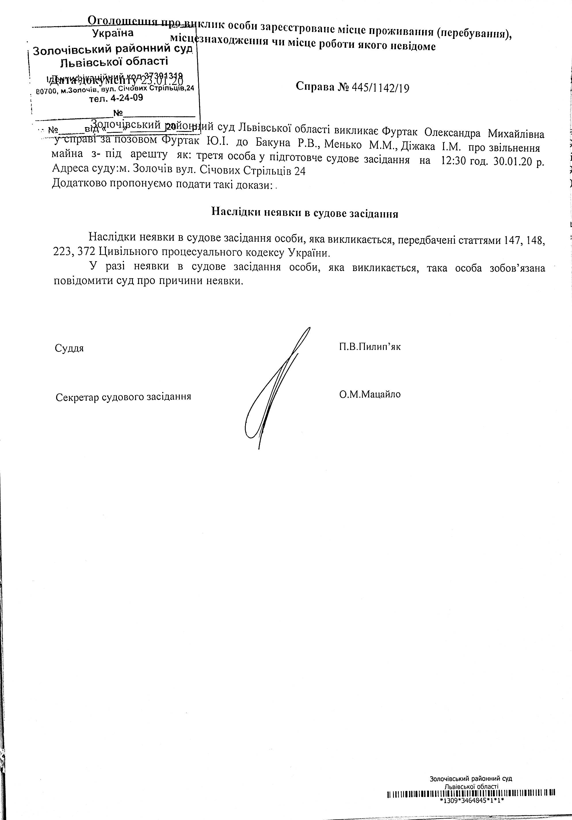 Оголошення про виклик в судове засідання Фуртак О.М. як третя особа по справі № 445/1142/19 на 30.01.2020 року о 12:30 год.