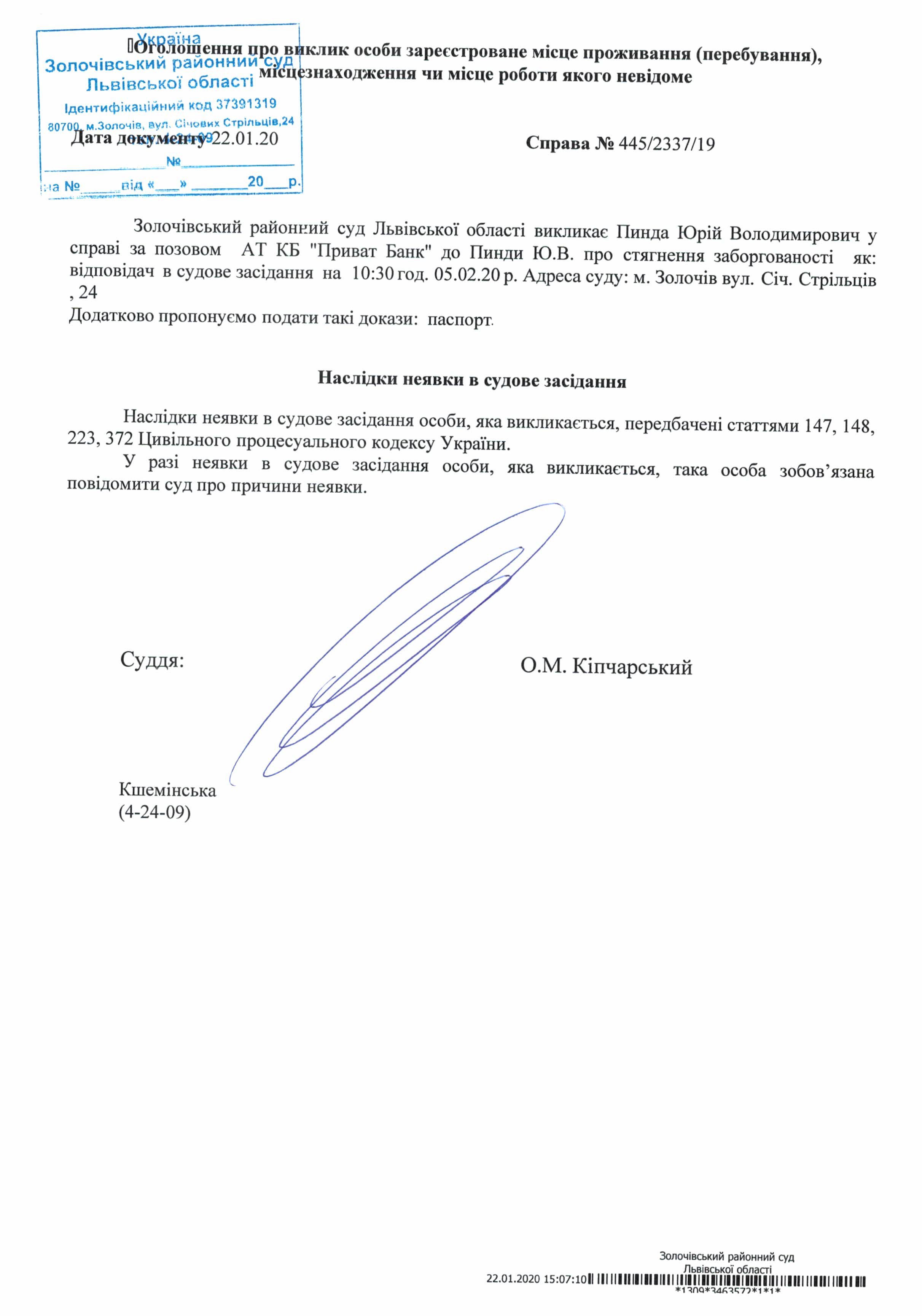 Оголошення про виклик в судове засідання Пинда Ю.В. відповідача по справі № 445/2337/19 на 05.02.2020 року о 10:30 год.