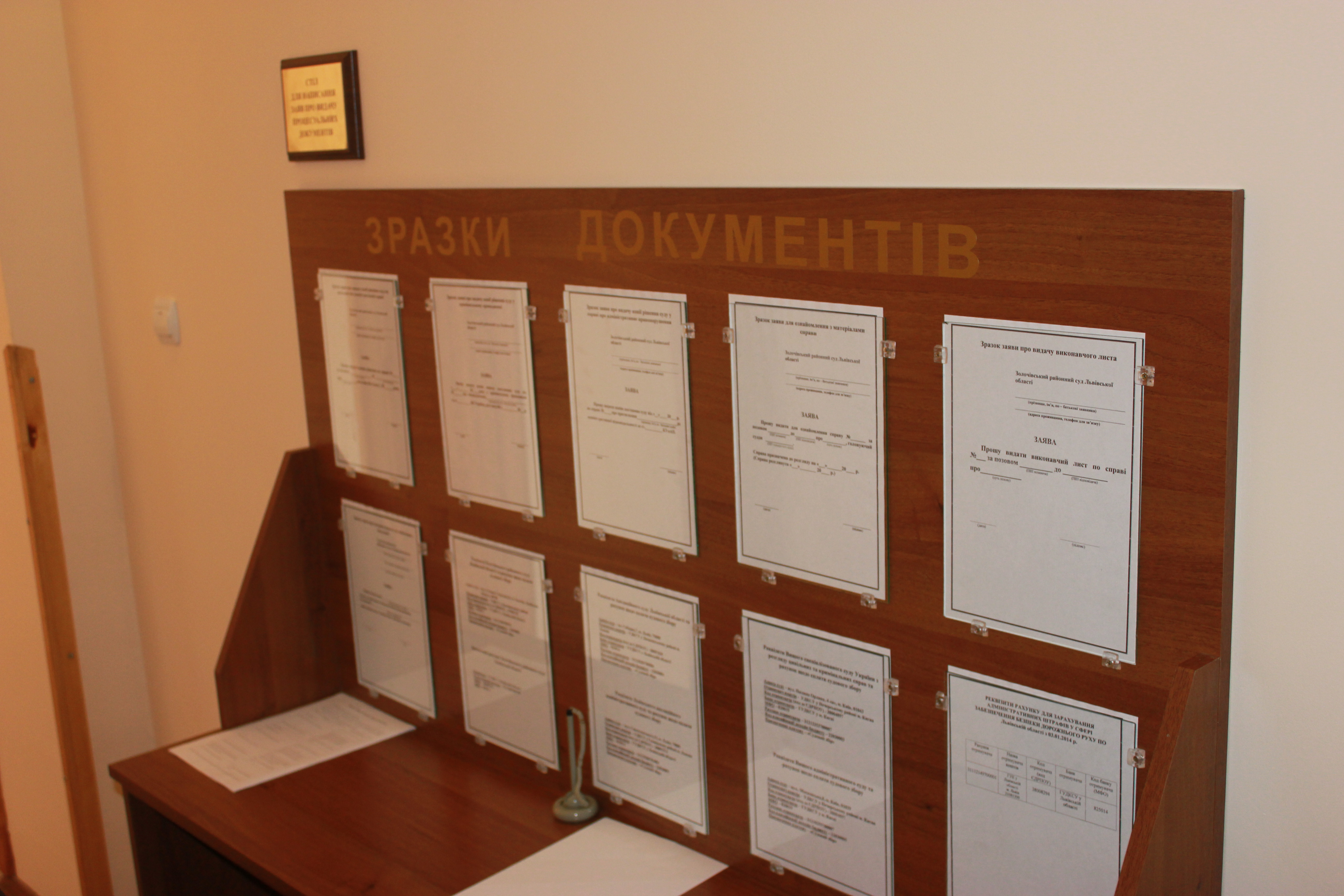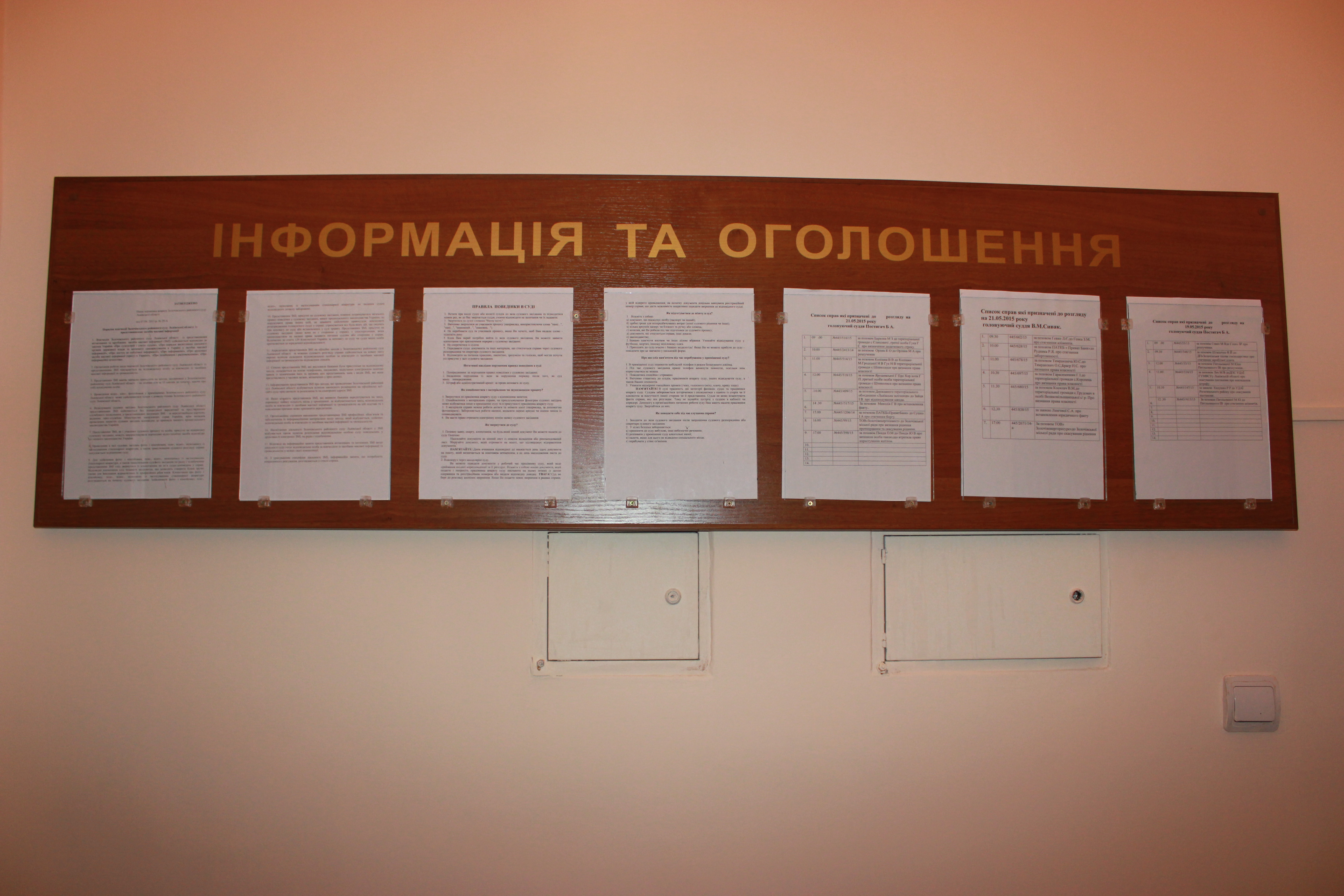 Крім цього, в Золочівському районному суді Львівської області за допомогою інформаційних стендів максимально повно висвітлені дані щодо керівництва суду, графіків особистого прийому громадян, списків справ, призначених до розгляду, зразків заяв та звернень, правил перебування у суді.