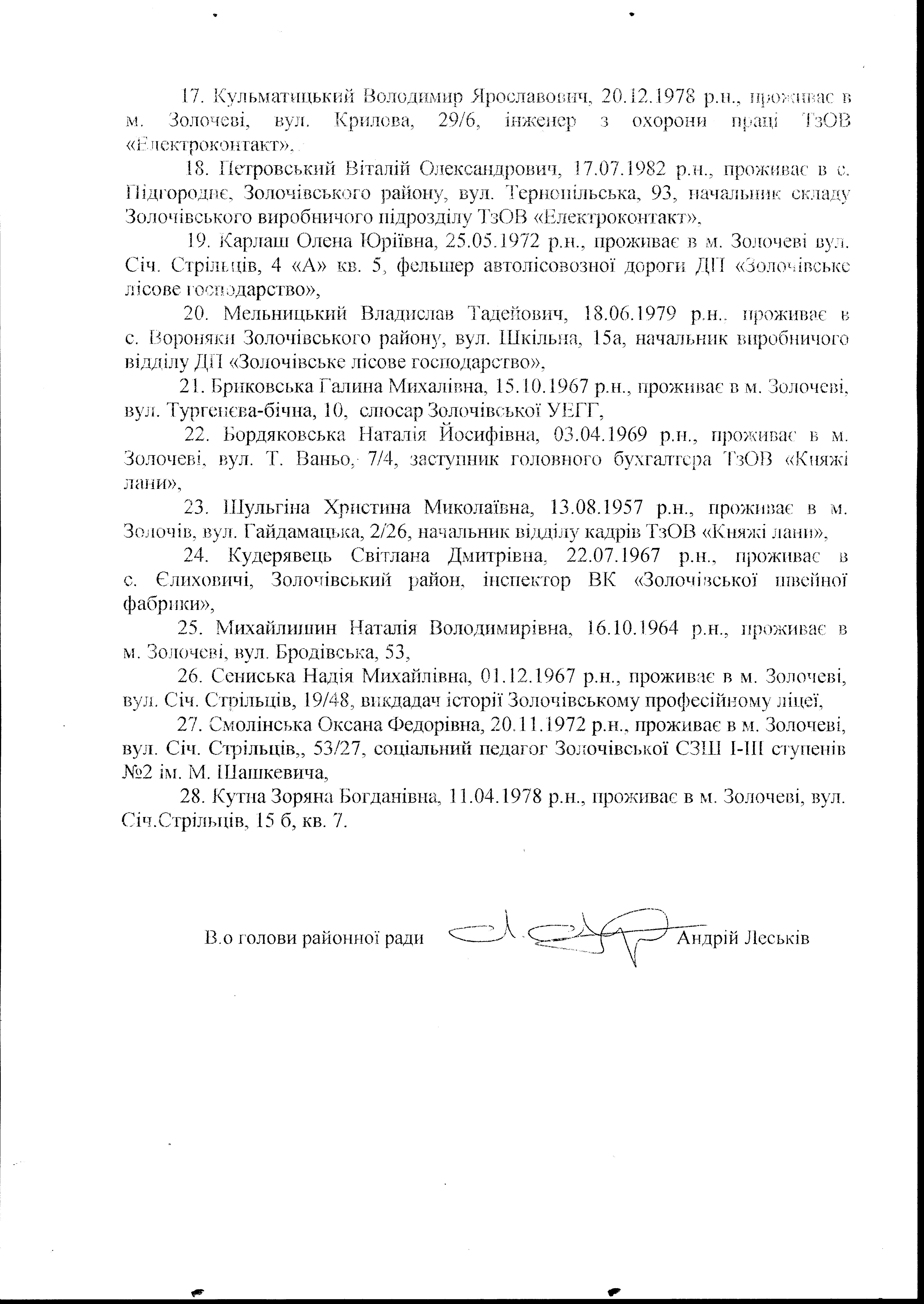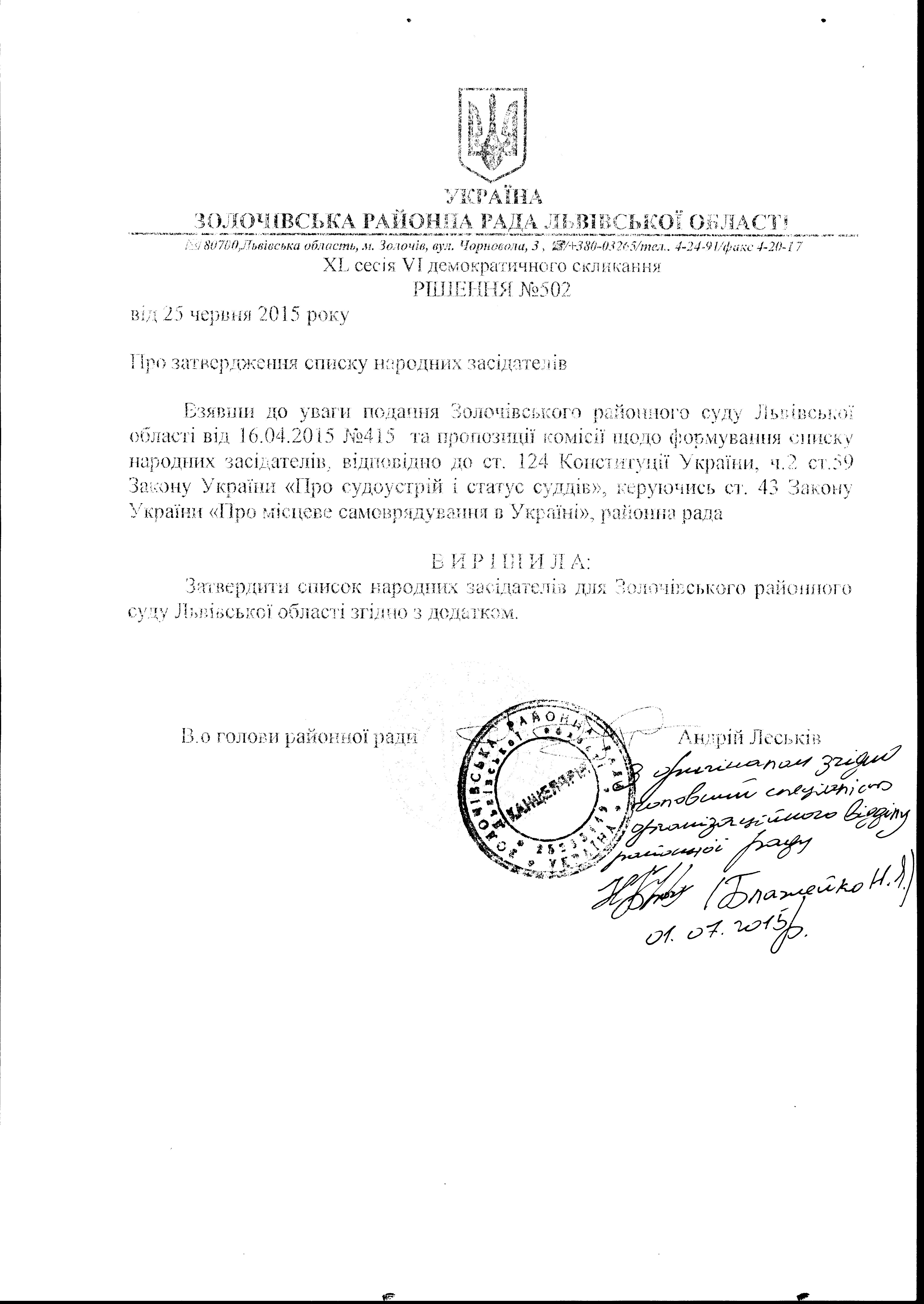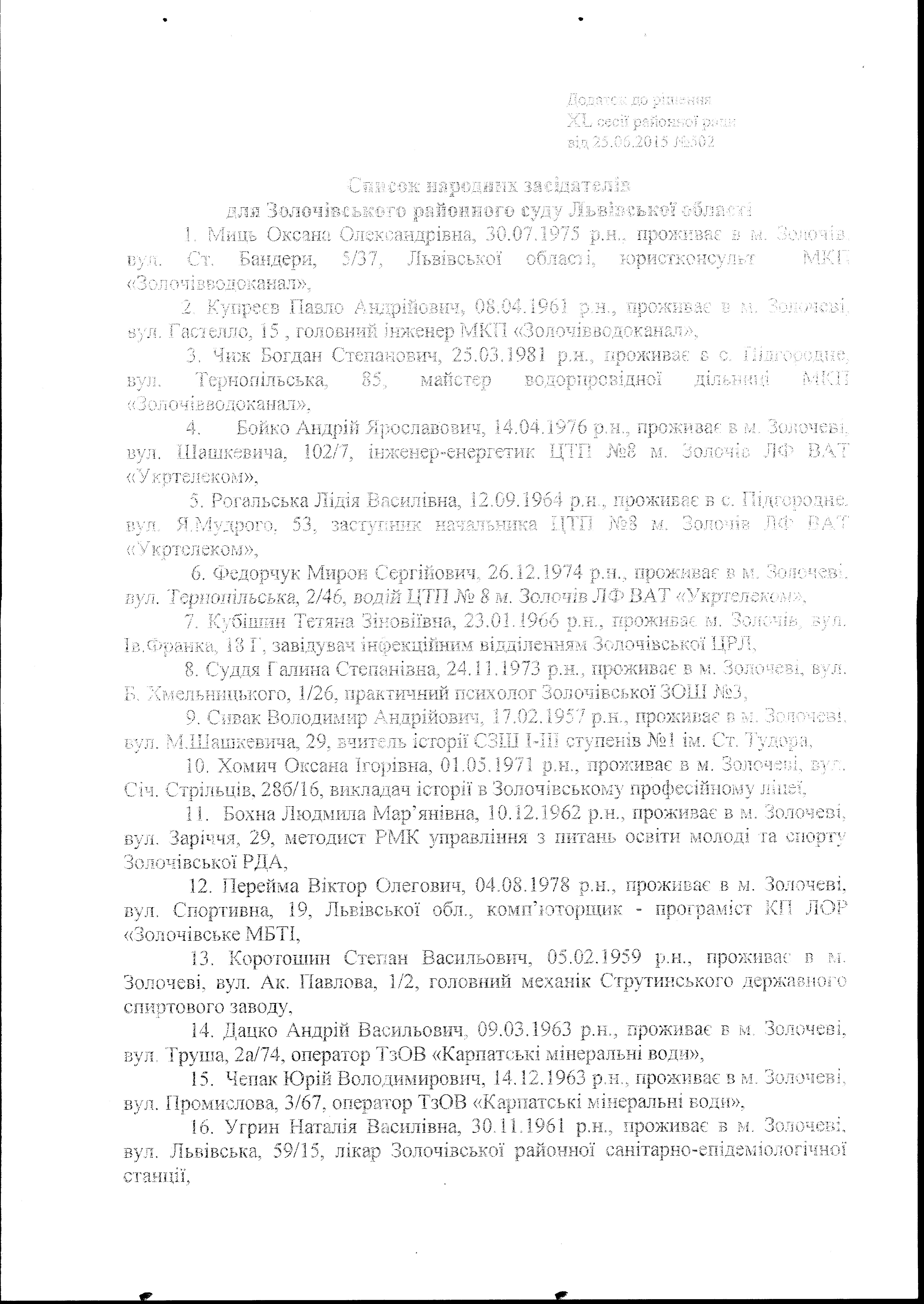 Рішенням XL сесії VI демократичного скликання Золочівської районної ради Львівської області № 502 від 26 червня 2015 року «Про затвердження списку народних засідателів» відповідно до ст. 124 Конституції України, ч.2 ст. 59 Закону України «Про судоустрій і статус суддів» затверджено список народних засідателів для Золочівського районного суду Львівської області.