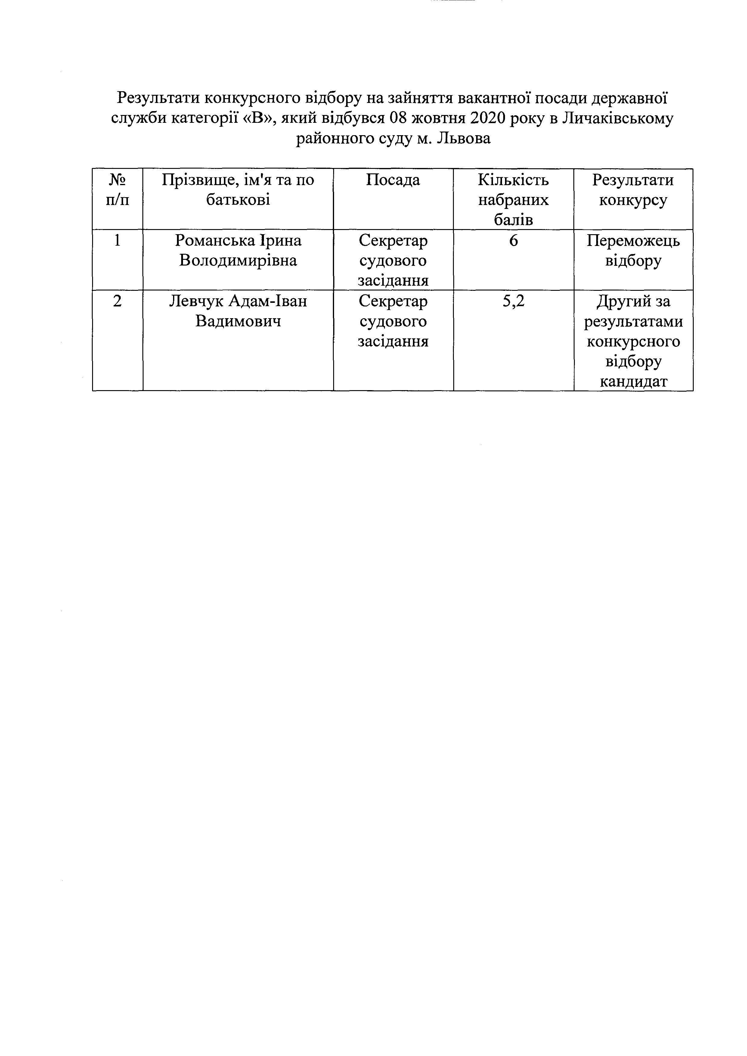 Результати конкурсного відбору на зайняття вакантної посади державної служби категорії "В" який відбувався 09 жовтня 2020 року в Личаківському районного суду м. Львова