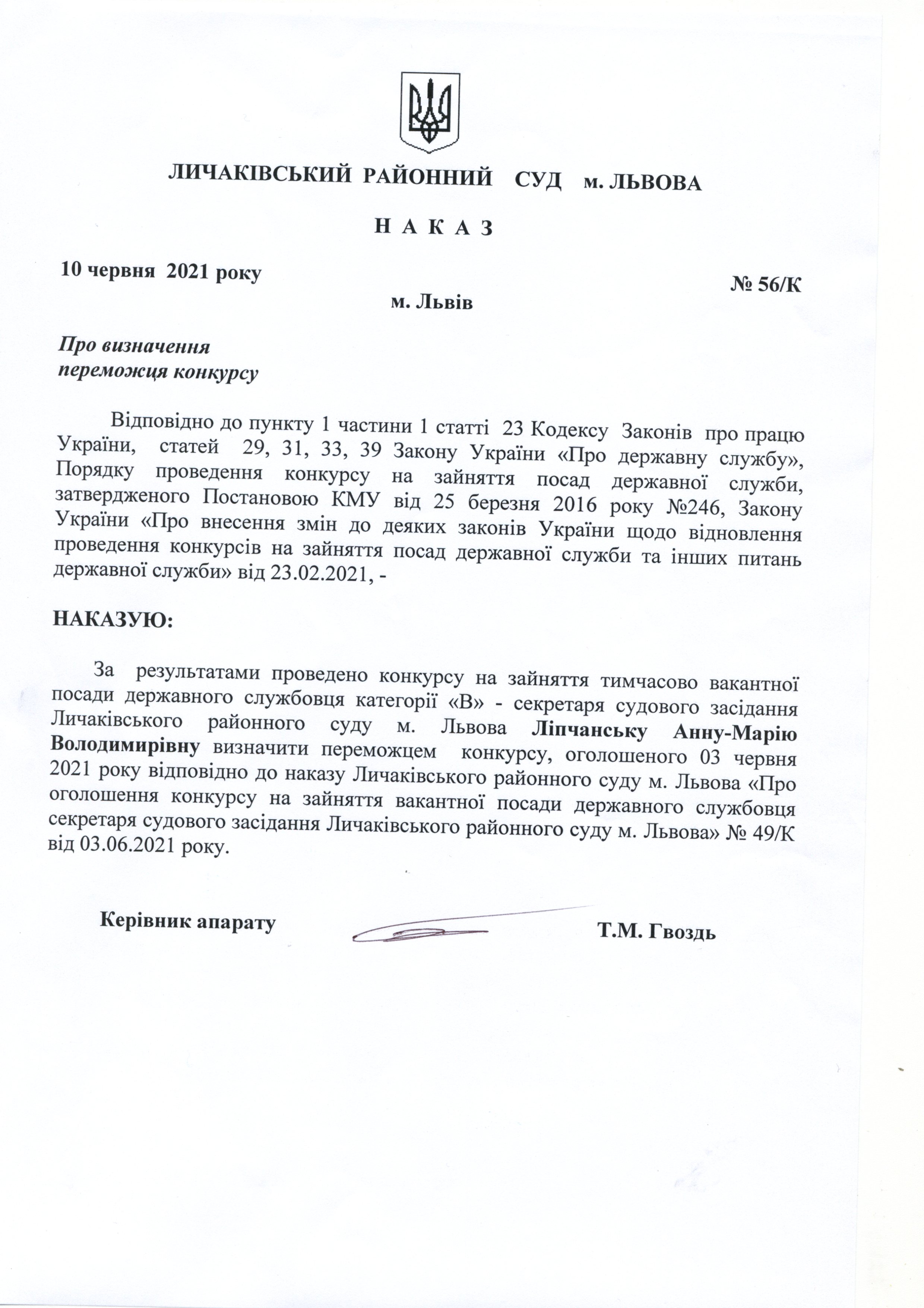Результати конкурсного відбору на зайняття вакантної посади державної служби категорії "В" який відбувався 03 червня 2021 року в Личаківському районного суду м. Львова