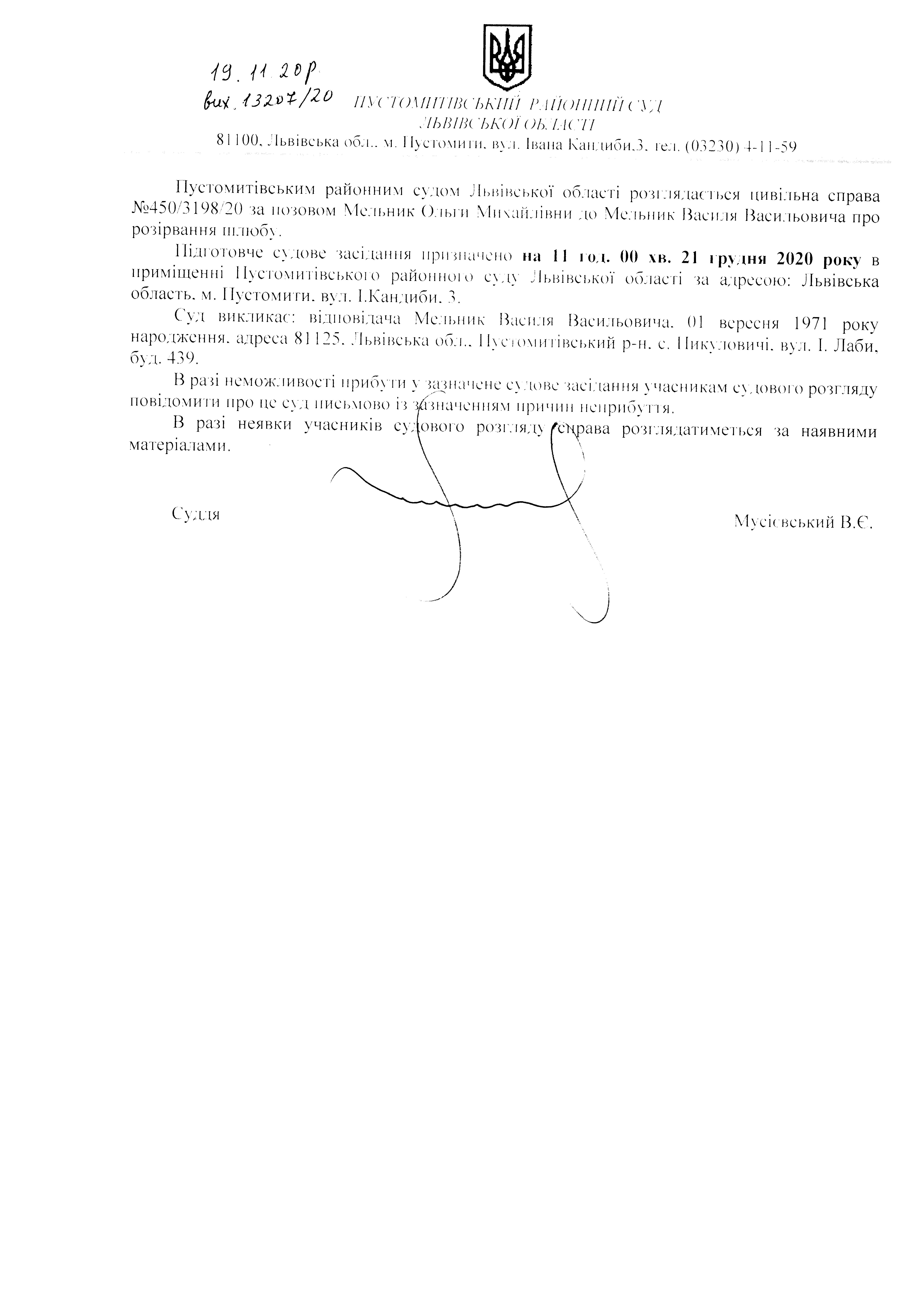 Оголошення про виклик відповідача -Мельник Василя Васильовича