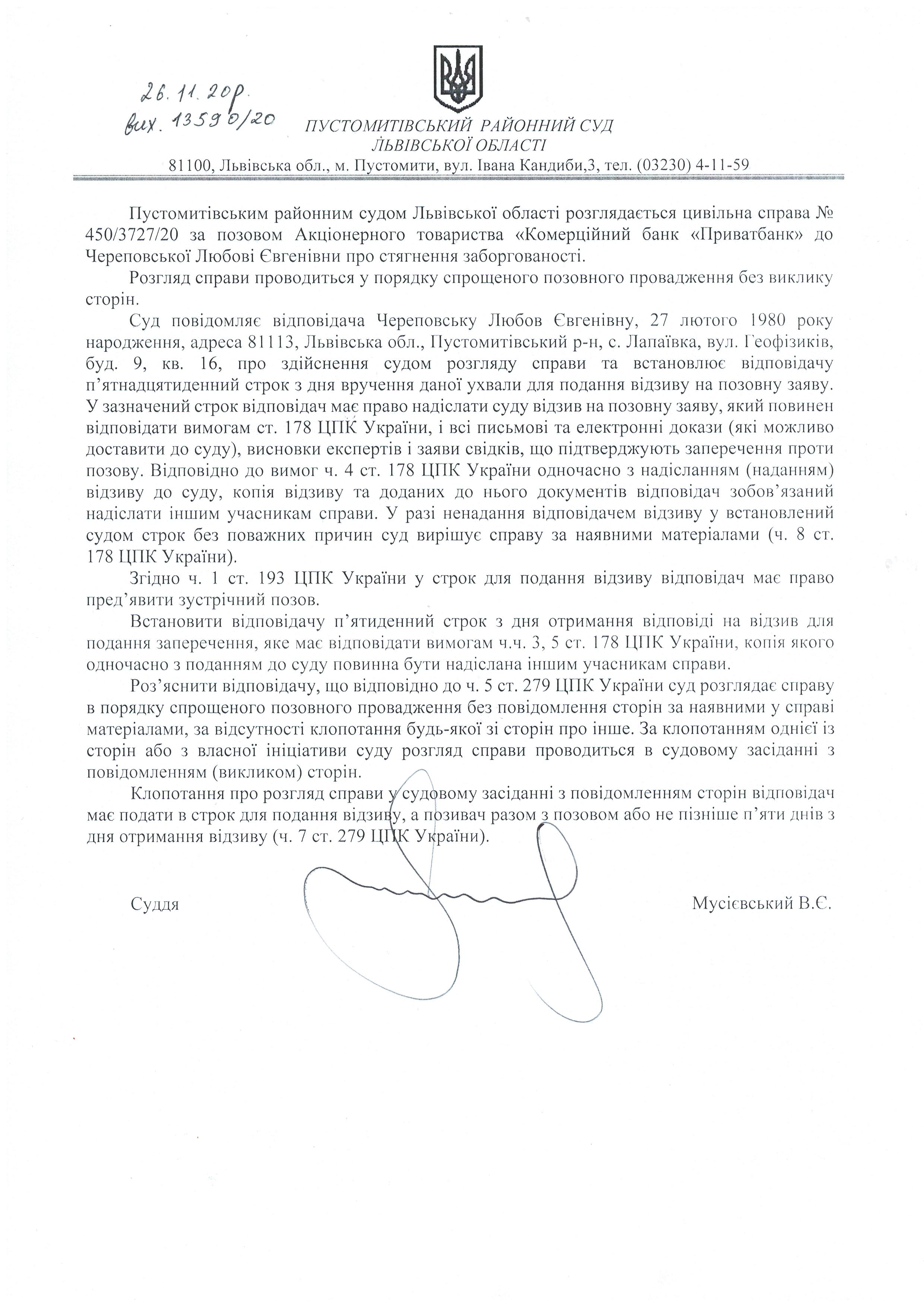 Оголошення про виклик відповідача -Череповську Любов Євгенівну