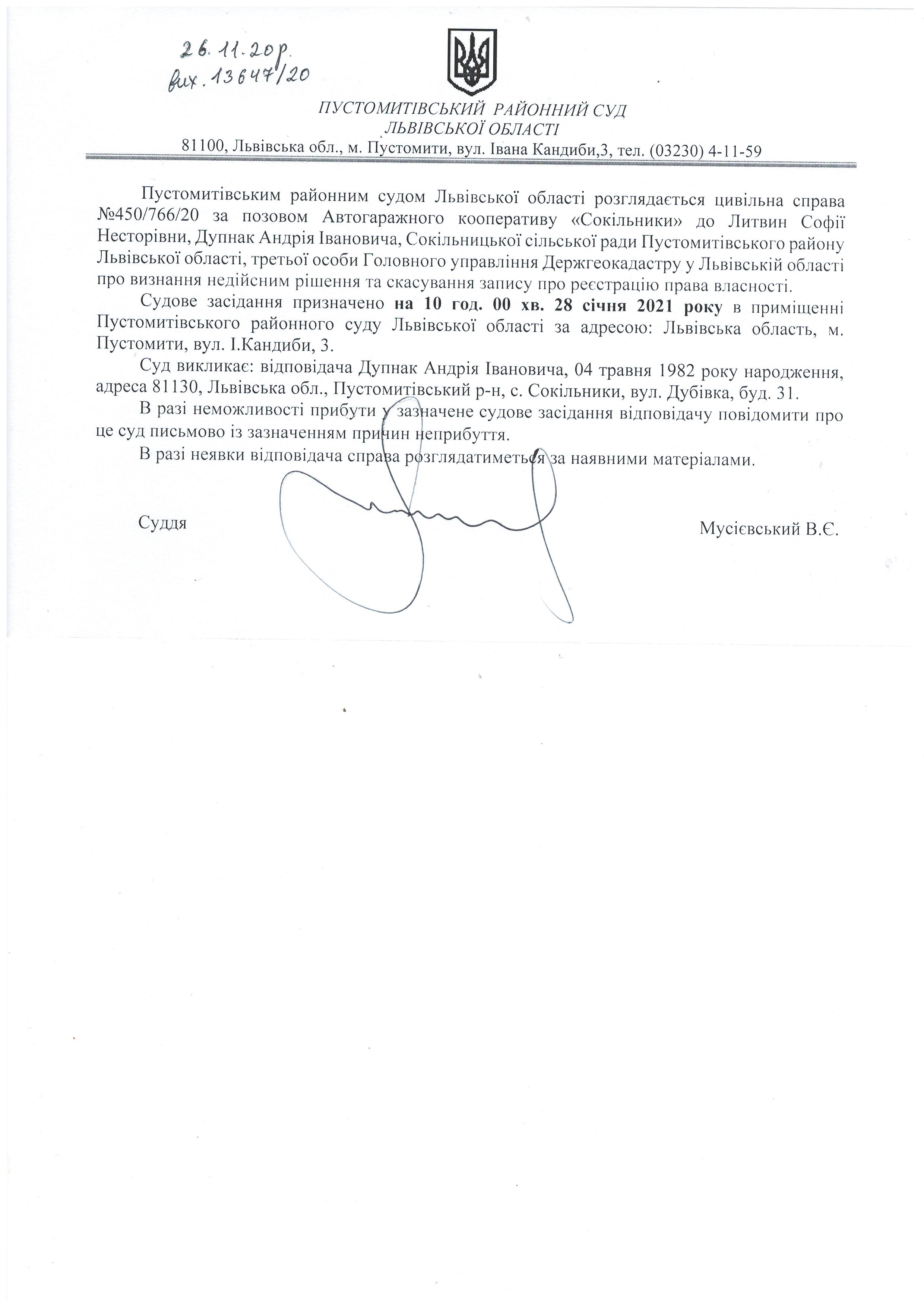 Оголошення про виклик відповідача -Дупнак Андрія Івановича
