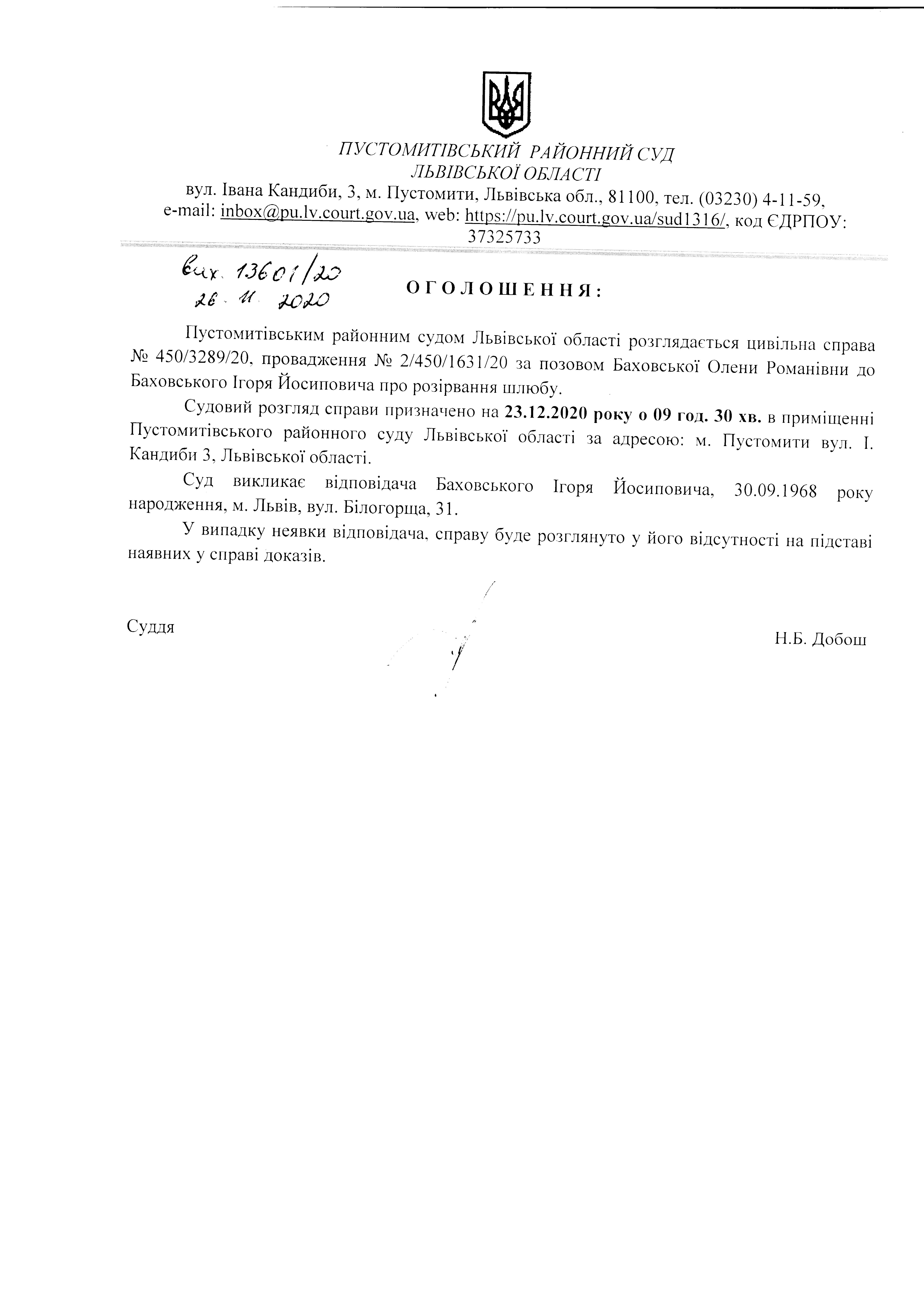 Оголошення про виклик відповідача -Баховського Ігоря Йосиповича