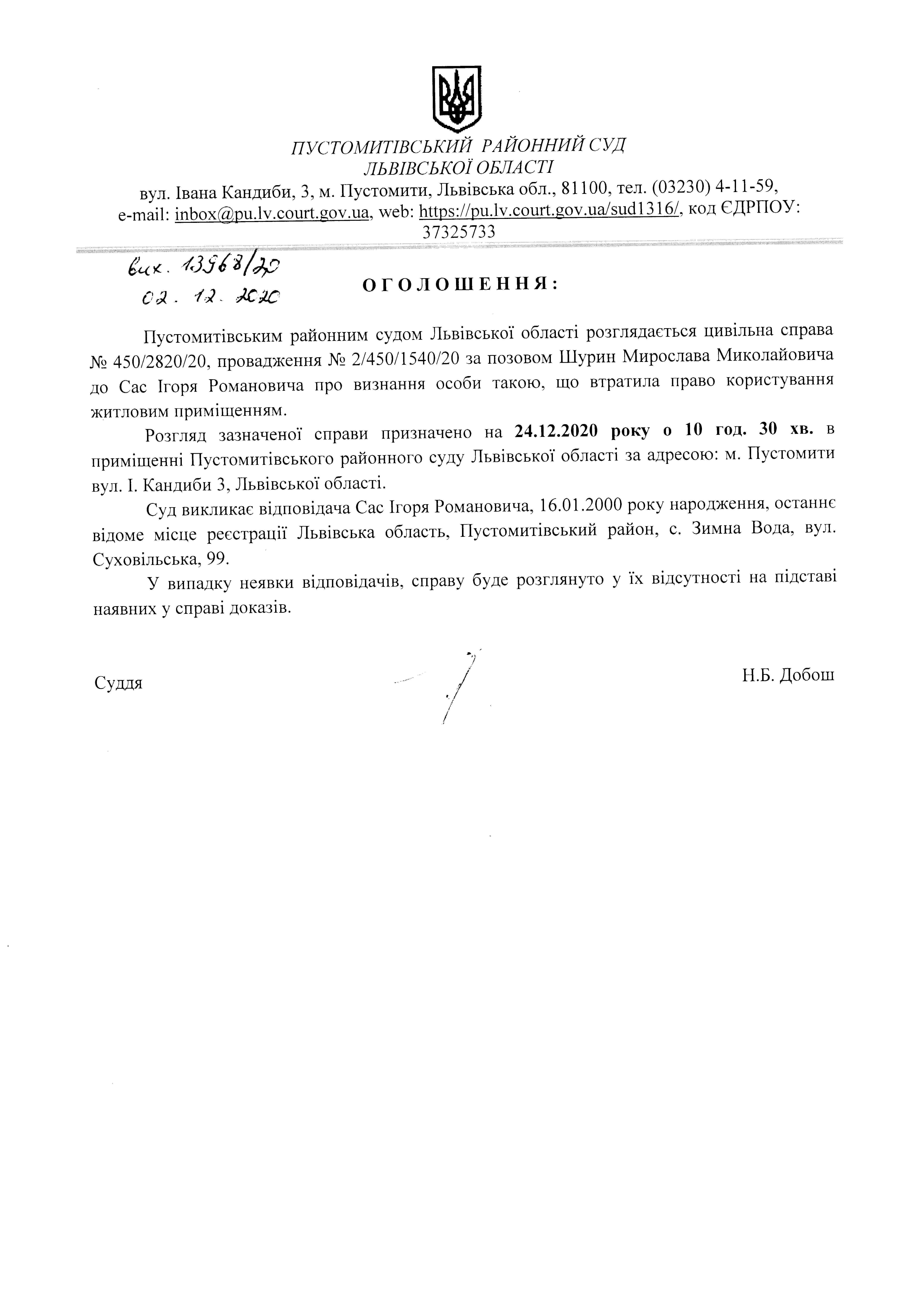 Оголошення про виклик відповідача -Сас Ігоря Романовича