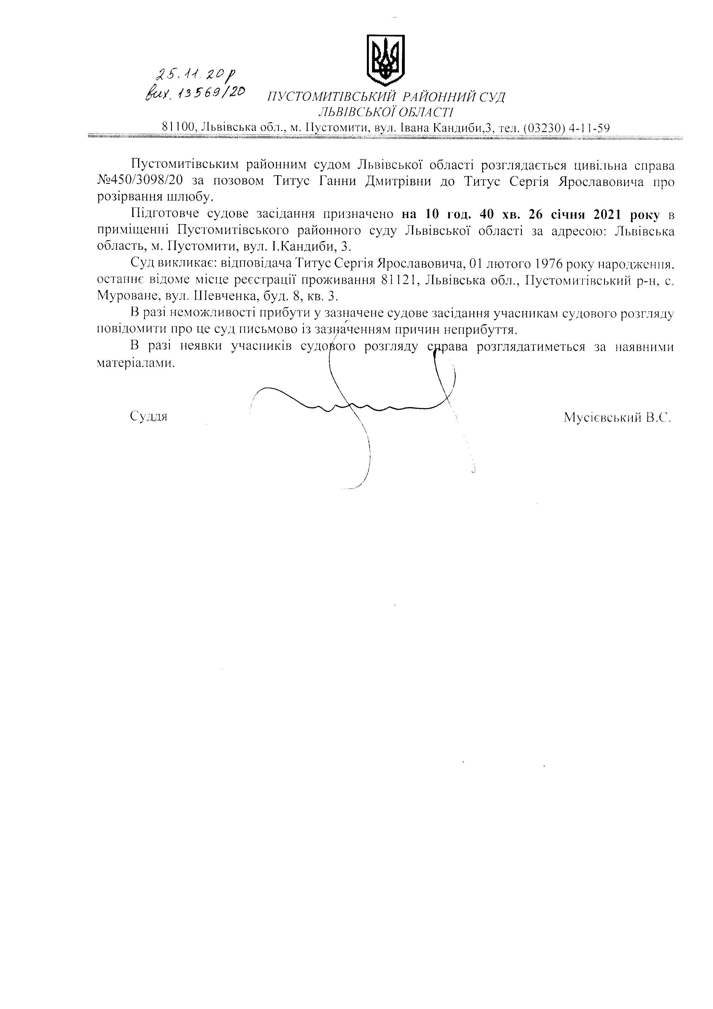 Оголошення про виклик відповідача -Титус Сергія Ярославовича