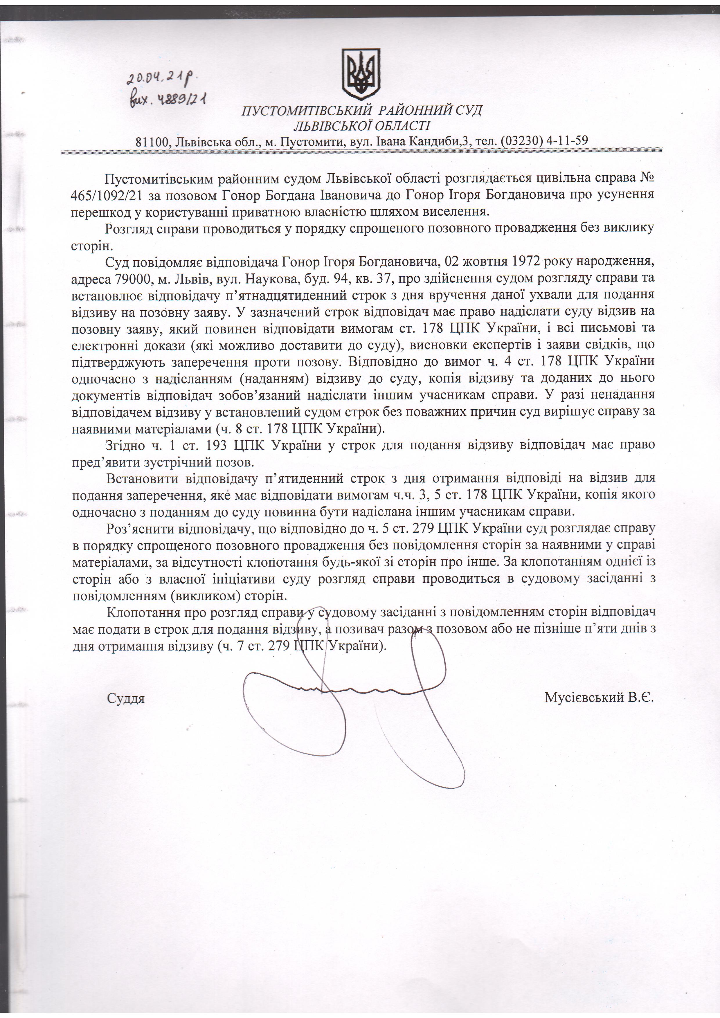 Оголошення про виклик відповідача - Гонор Ігоря Богдановича