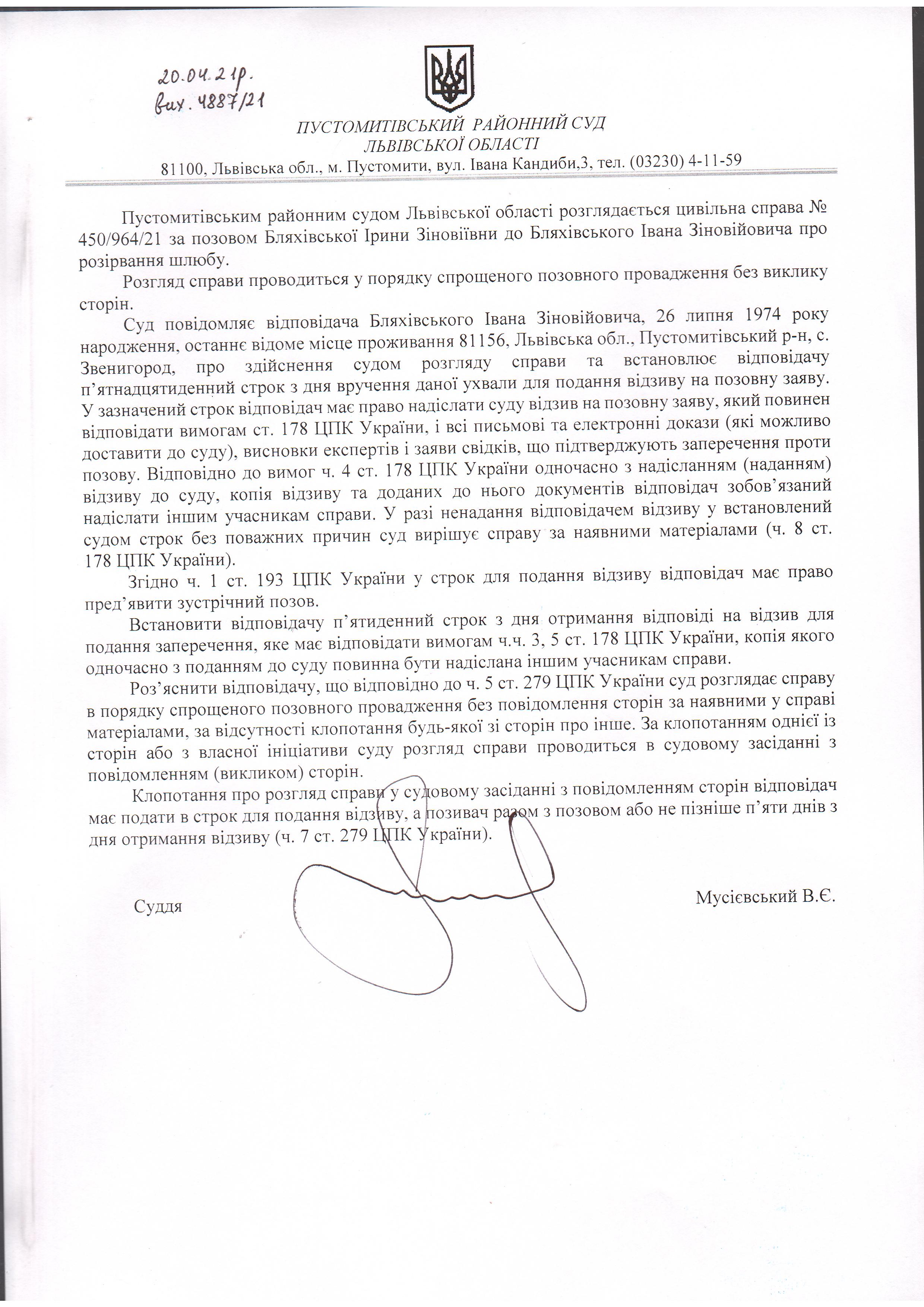 Оголошення про виклик відповідача - Бляхівського Івана Зіновійовича