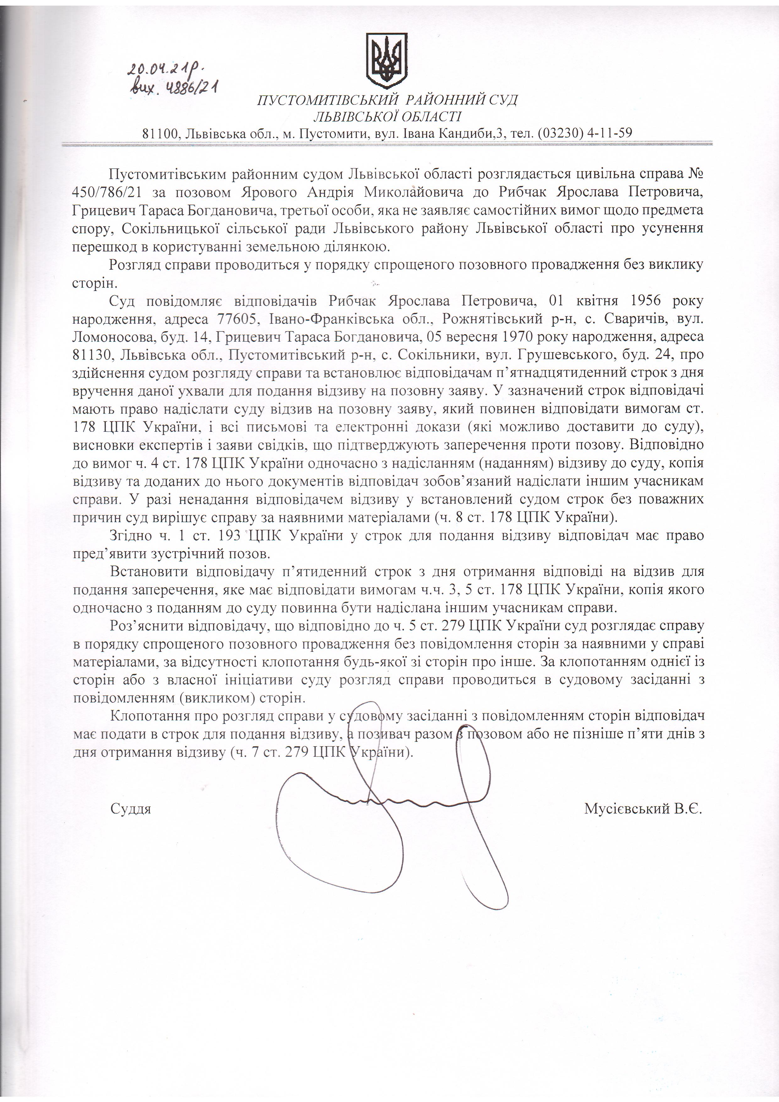 Оголошення про виклик відповідача - Рибчак Ярослава Петровича