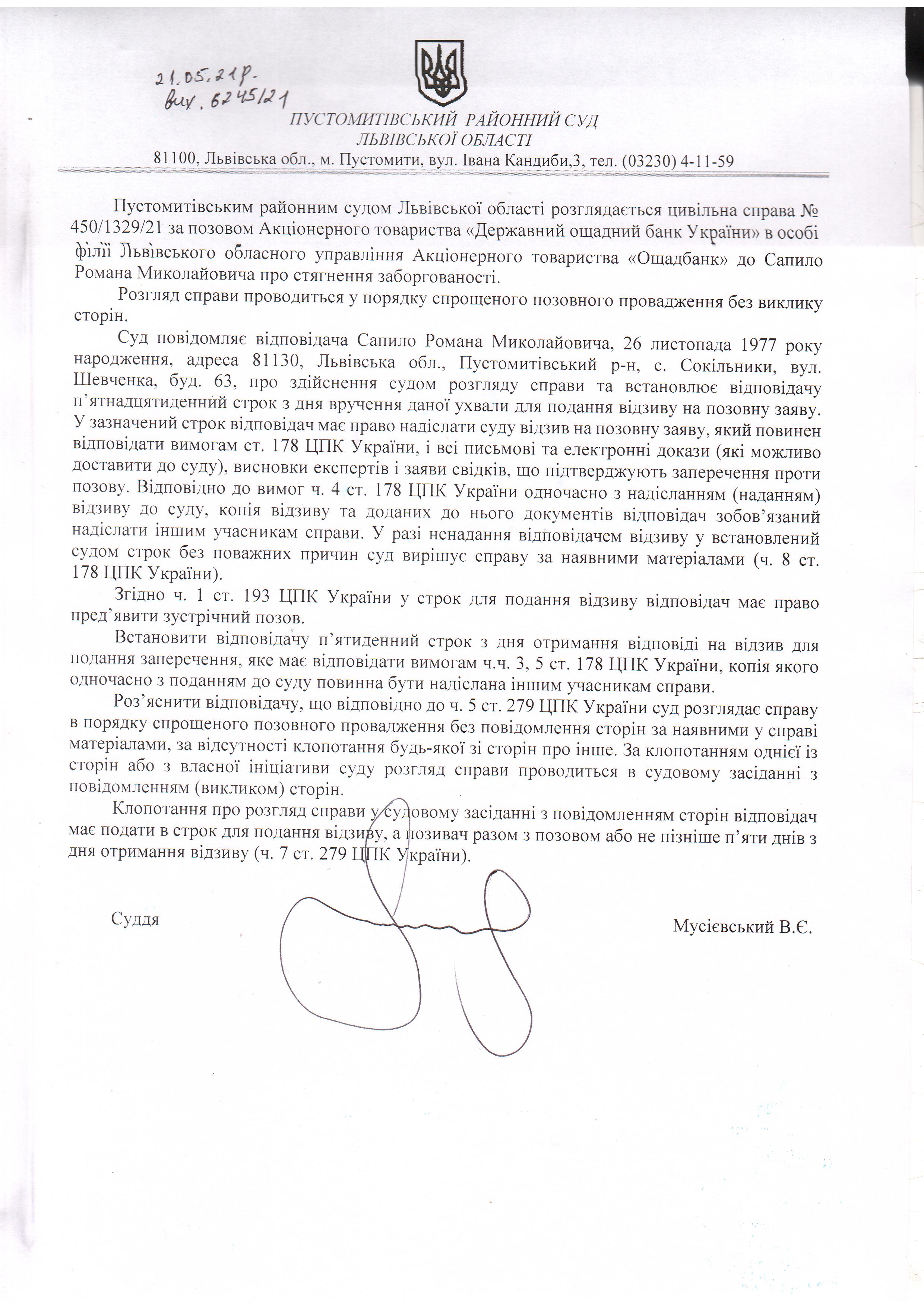 Оголошення про виклик відповідача - Сапило Романа Миколайовича