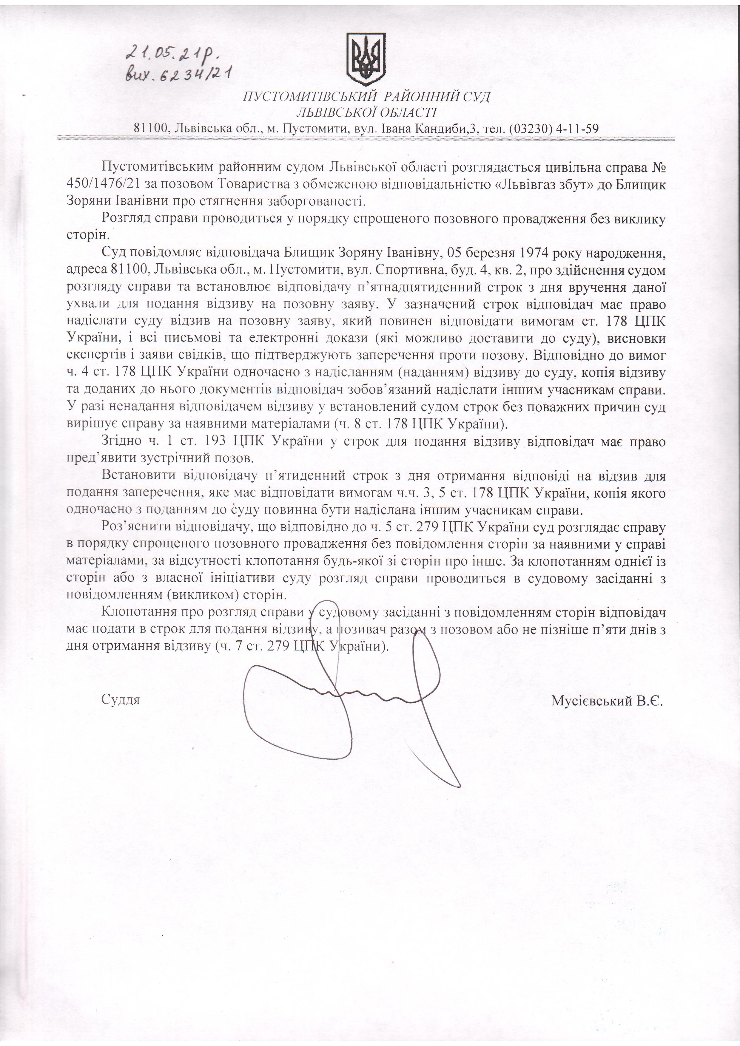 Оголошення про виклик відповідача - Блищик Зоряну Іванівну
