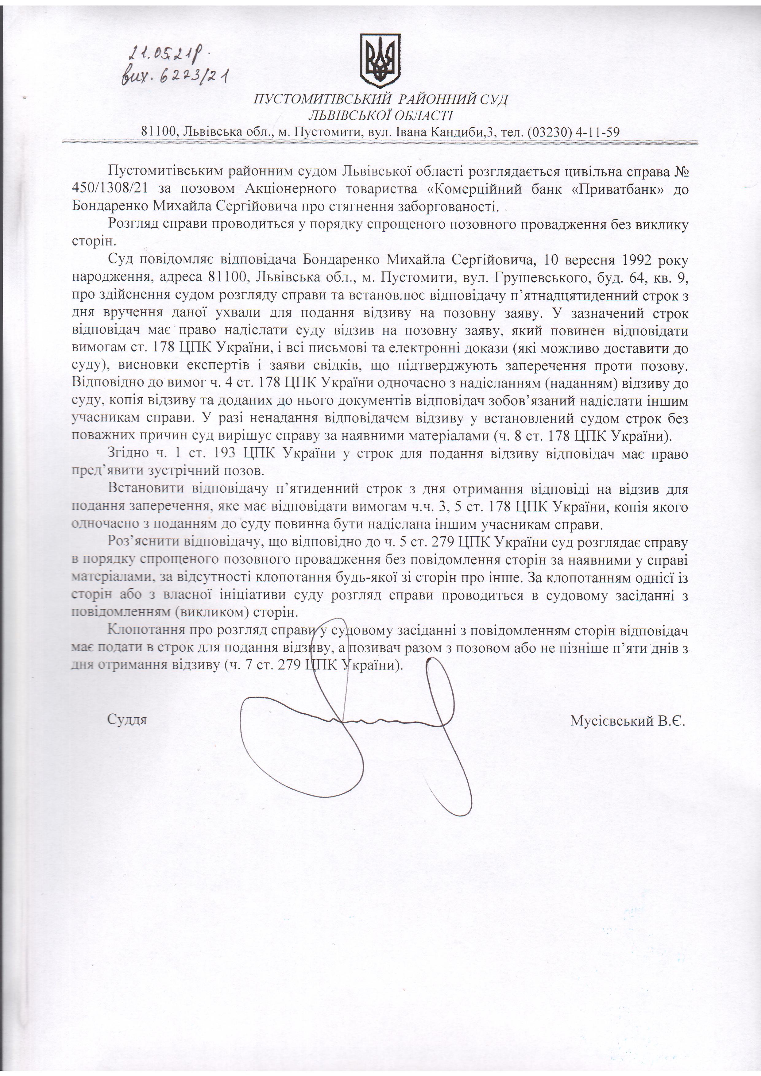 Оголошення про виклик відповідача - Бондаренко Михайла Сергійовича