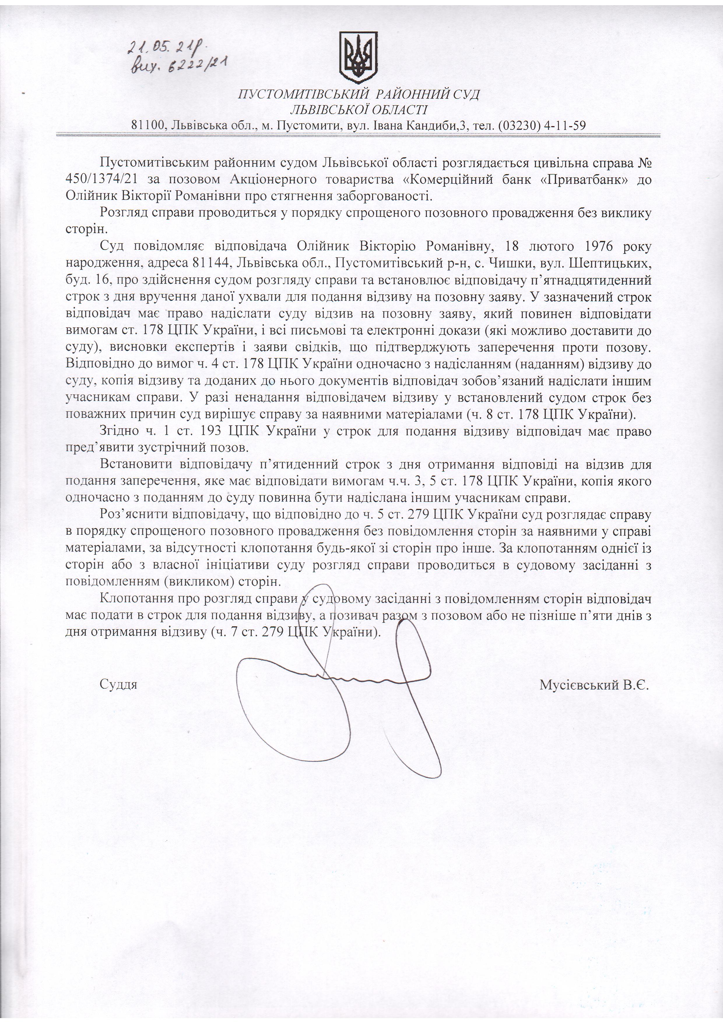 Оголошення про виклик відповідача - Олійник Вікторію Романівну