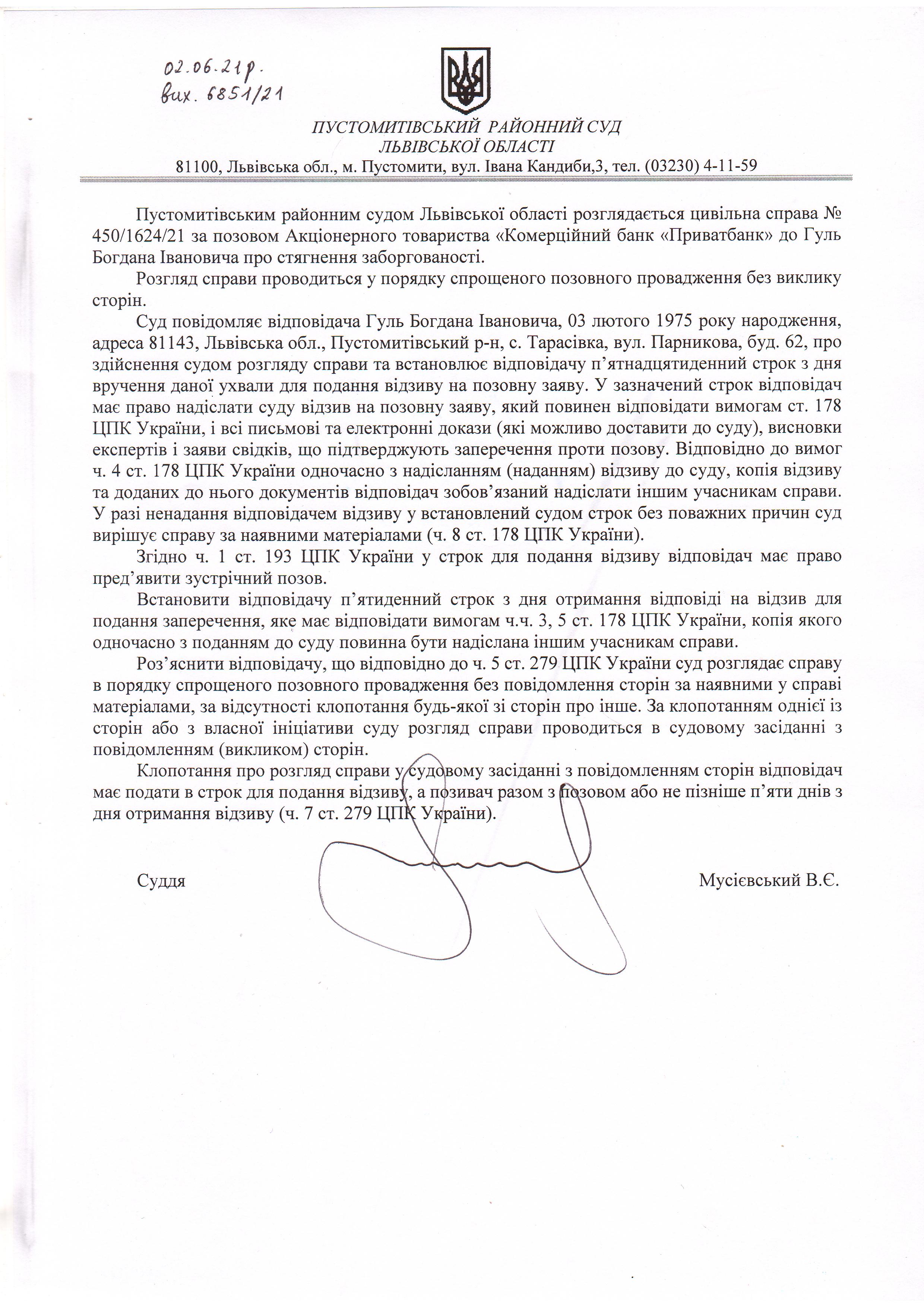 Оголошення про виклик відповідача - Гуль Богдана Івановича