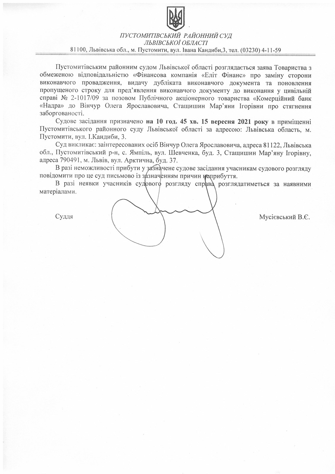 Оголошення про виклик відповідача - Стащишин Мар'яну Ігорівну