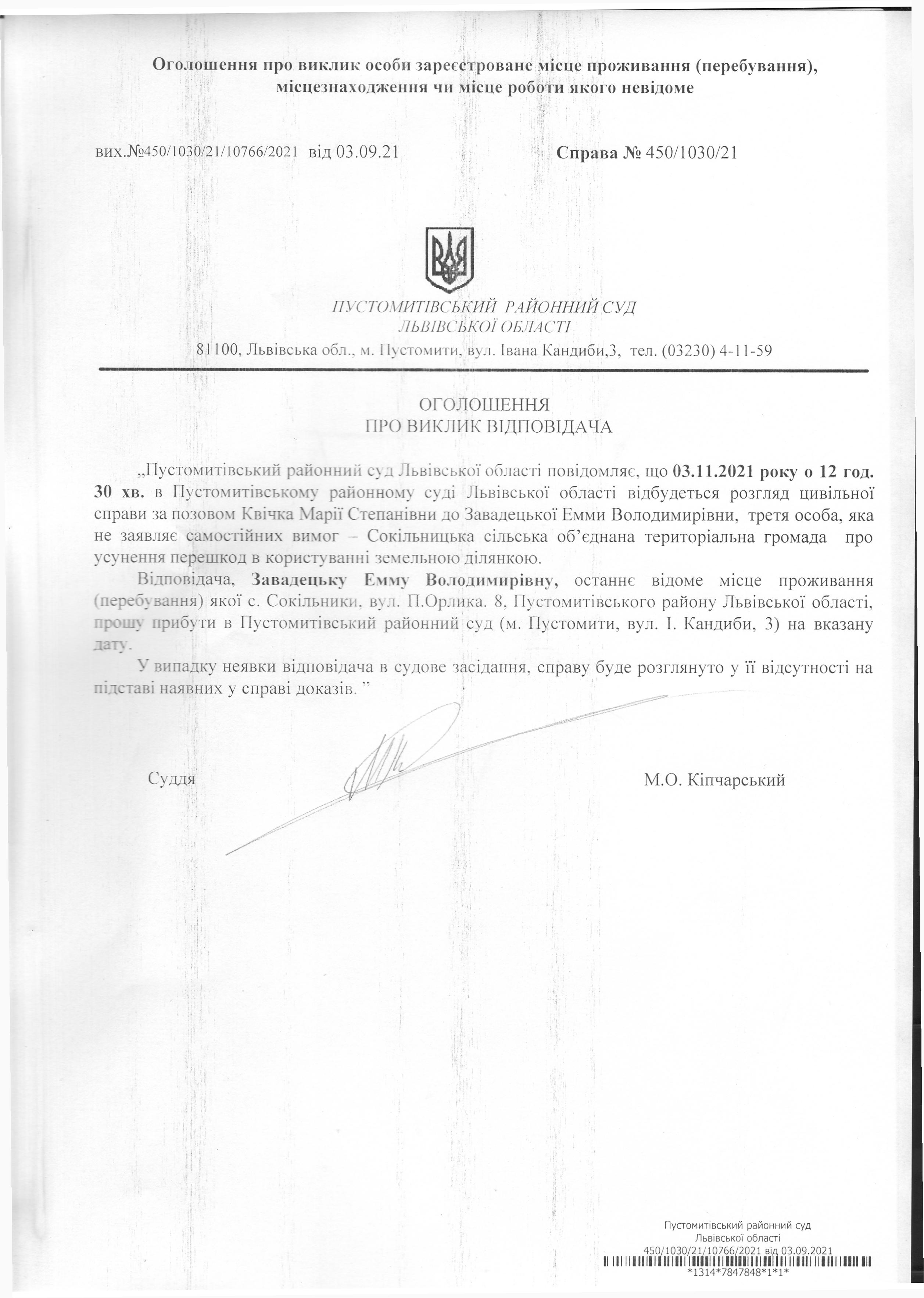 Оголошення про виклик відповідача - Завадецьку Емму Володимирівну