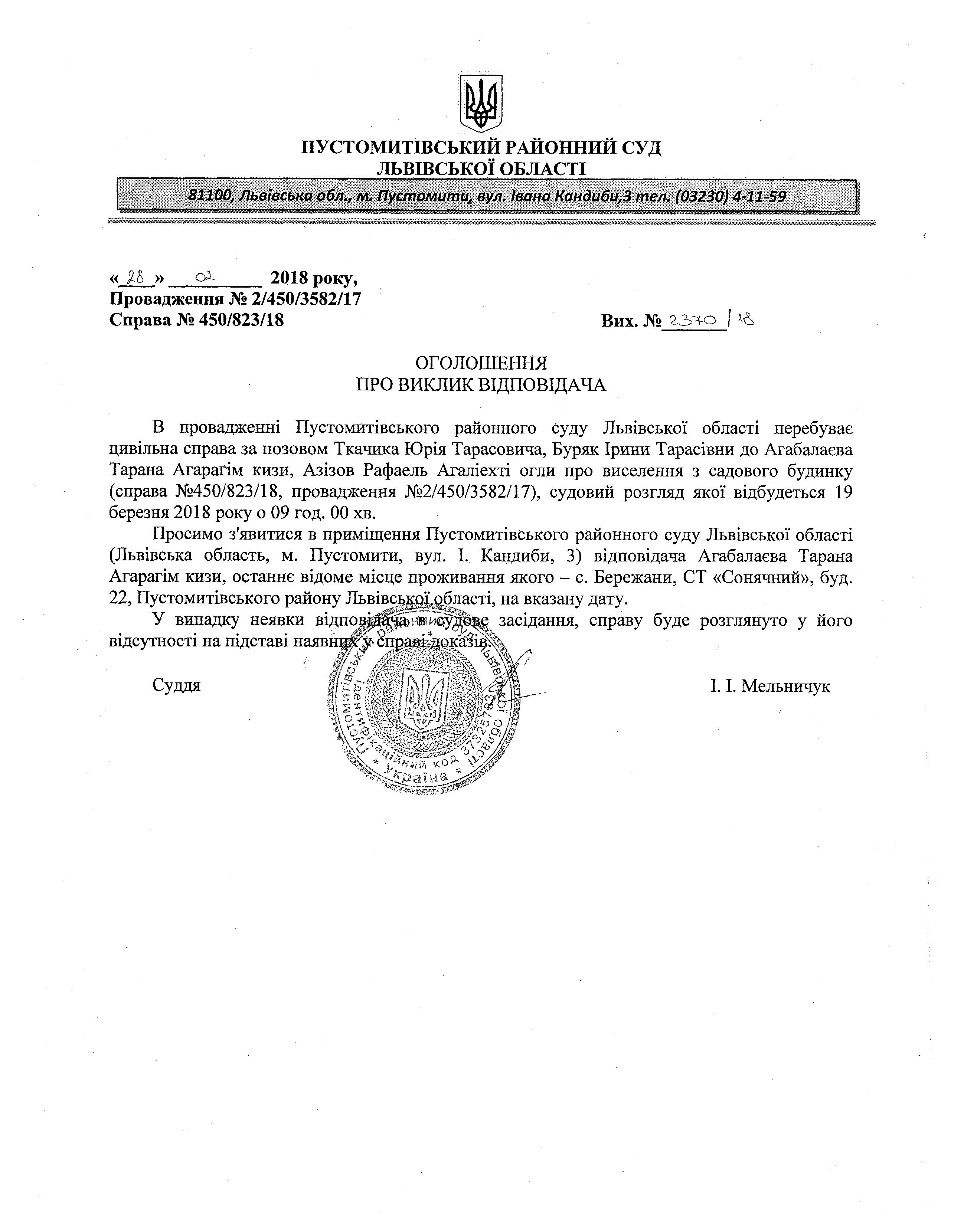 Оголошення про виклик відповідача - Агабалаєва Тарана Агарагім кизи