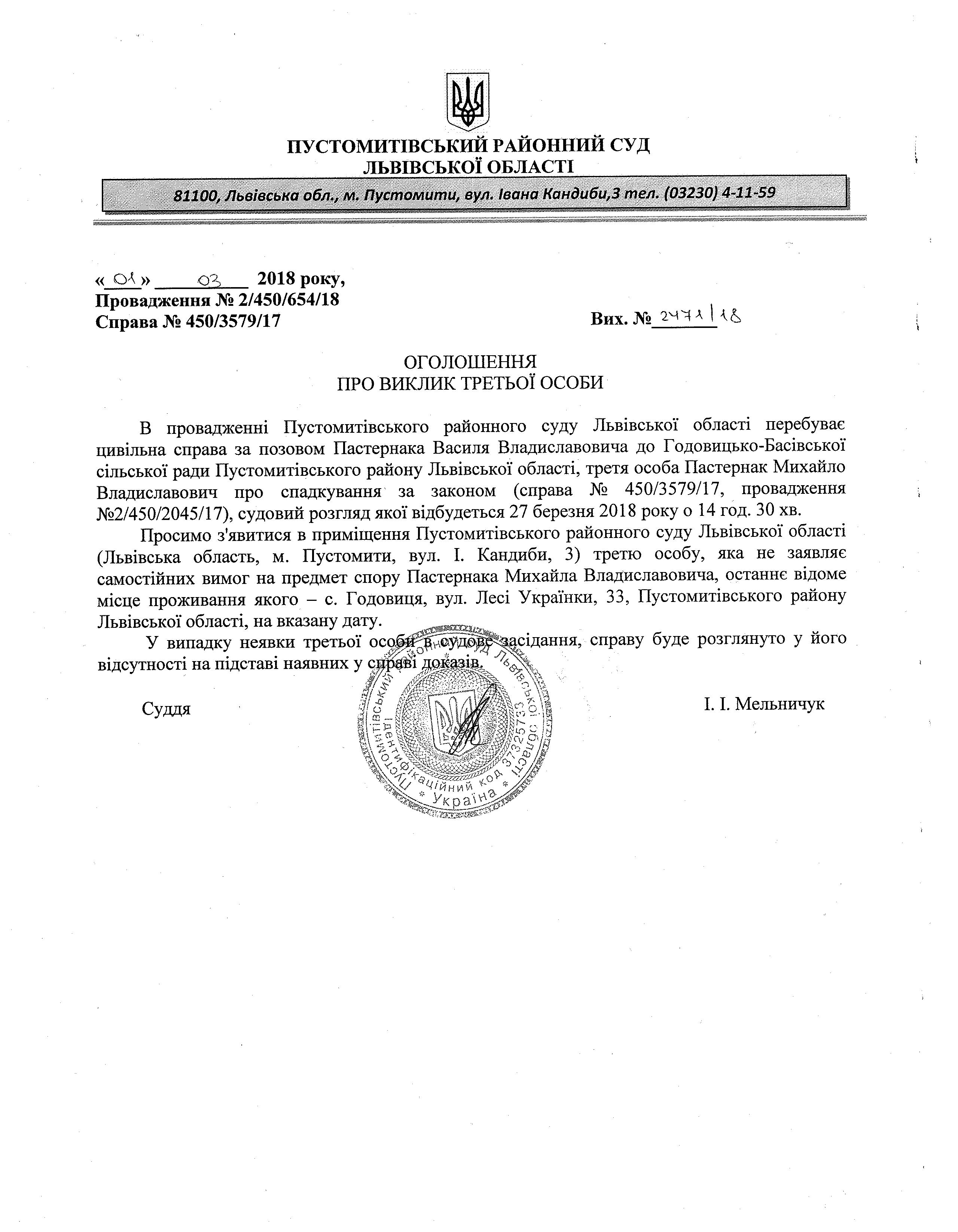 Оголошення про виклик третьої особи - Пастернака Михайла Владиславовича