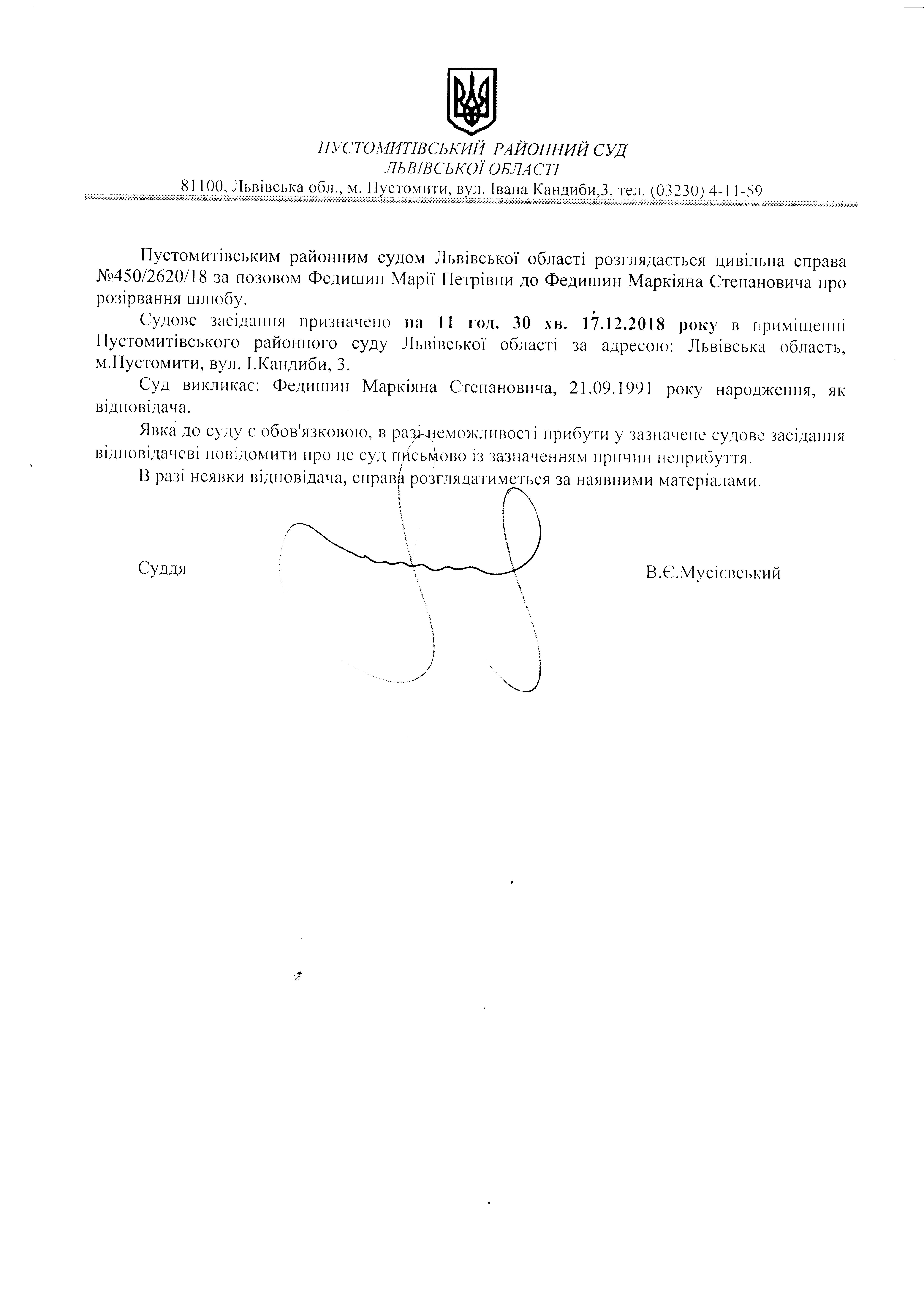 Оголошення про виклик відповідача - Федишина Маркіяна Степановича