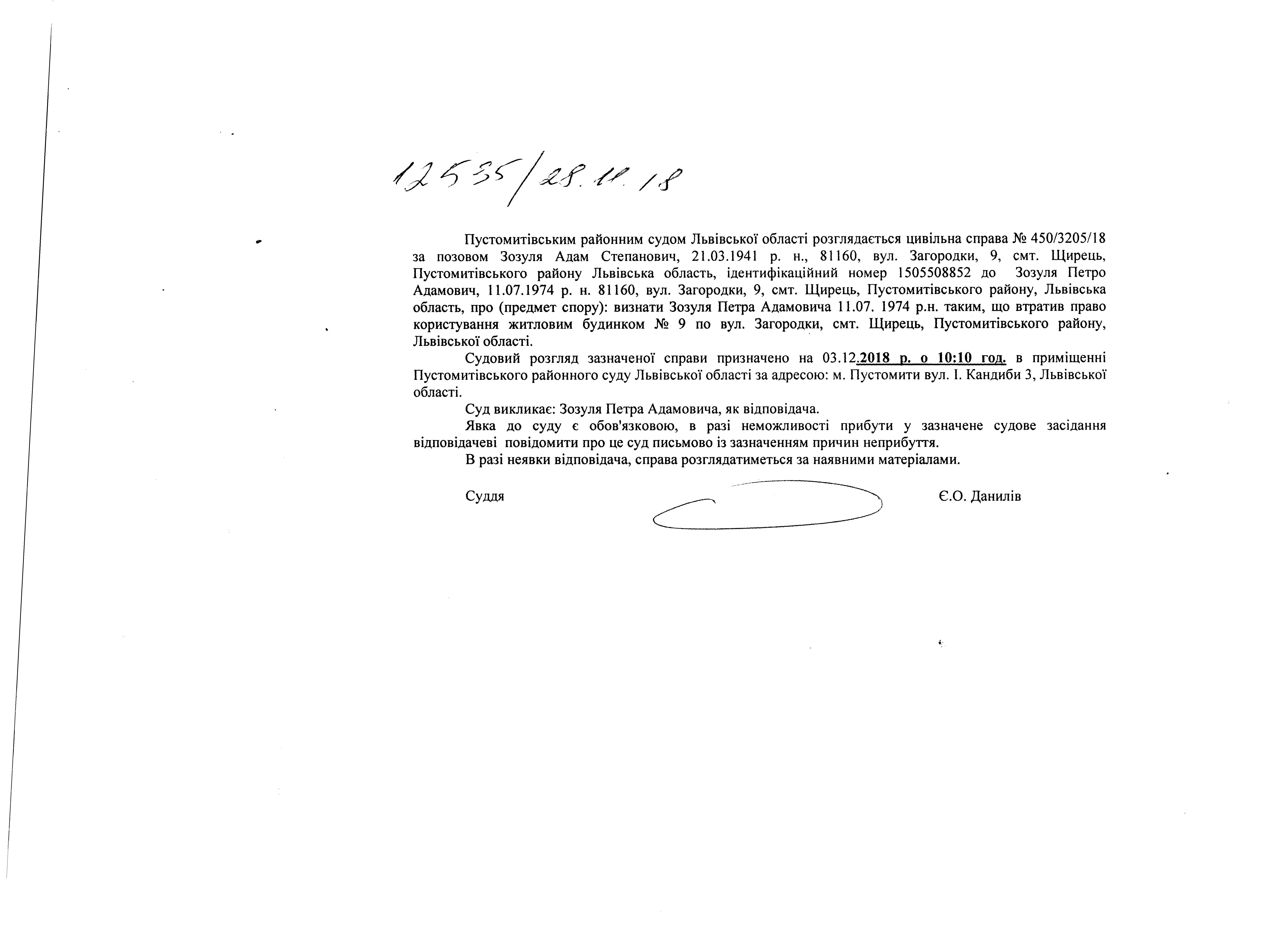 Оголошення про виклик відповідача - Зозулю Петра Адамовича