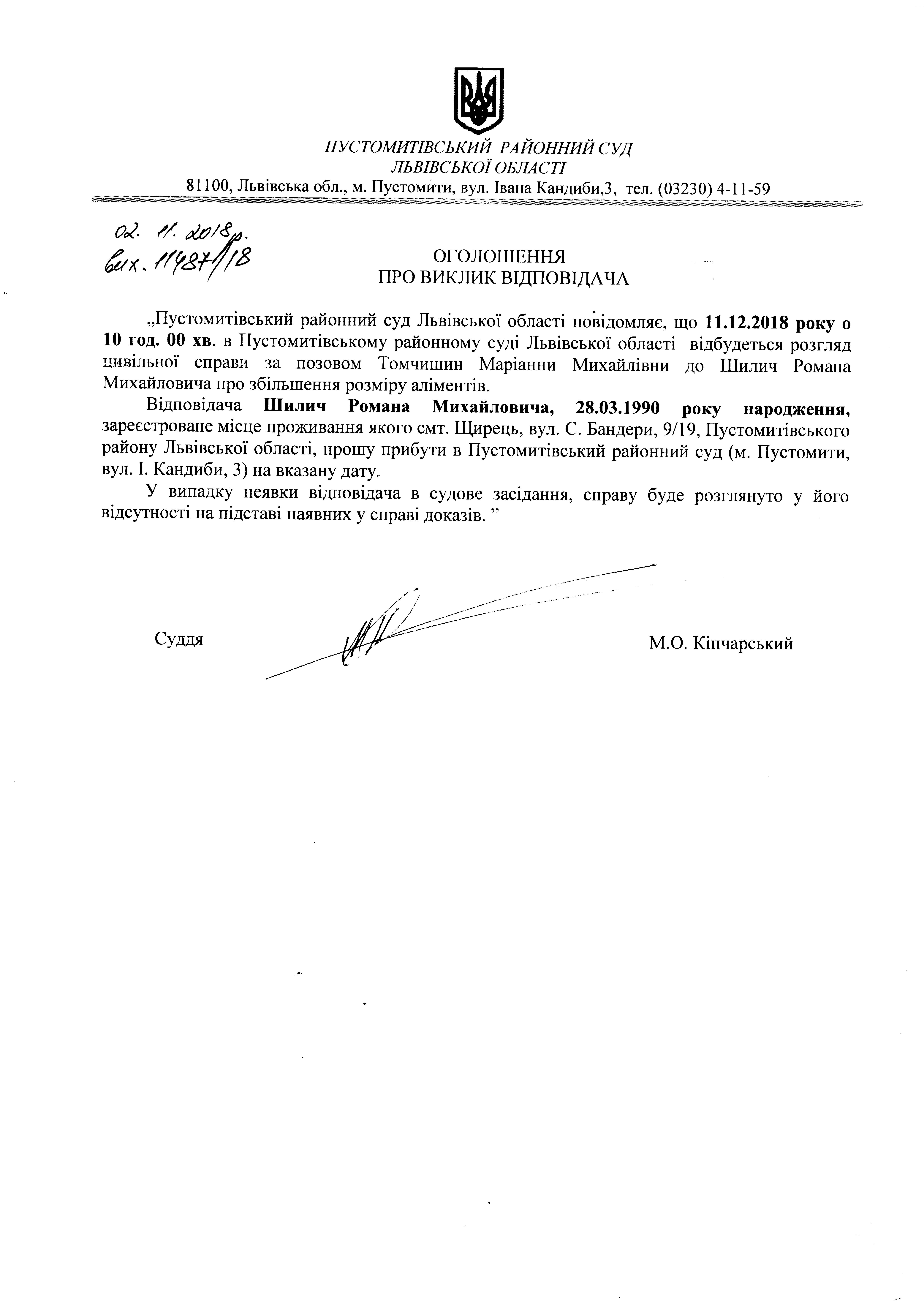 Оголошення про виклик відповідача - Шилич романа Михайловича