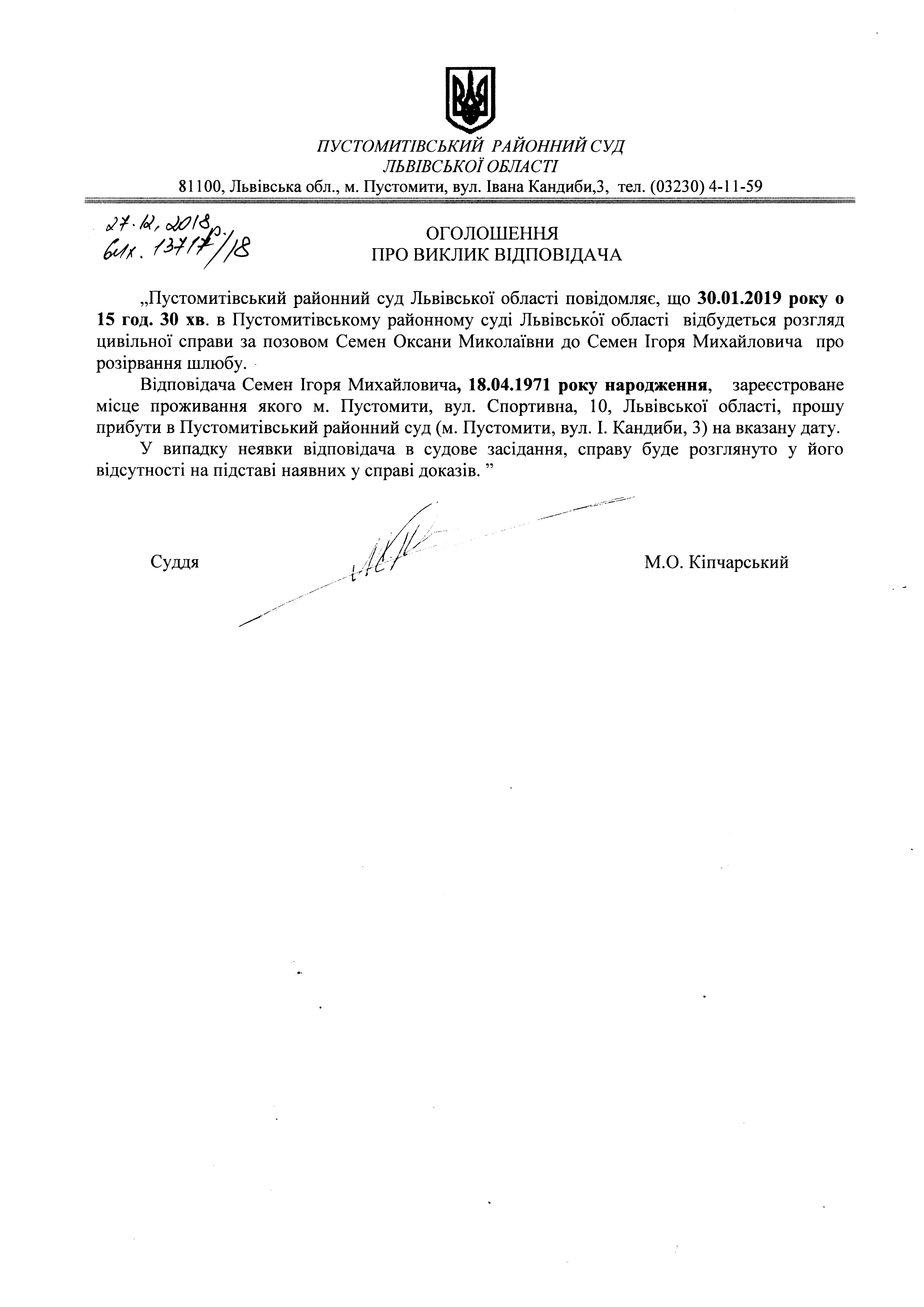 Оголошення про виклик відповідача - Семена Ігоря Михайловича