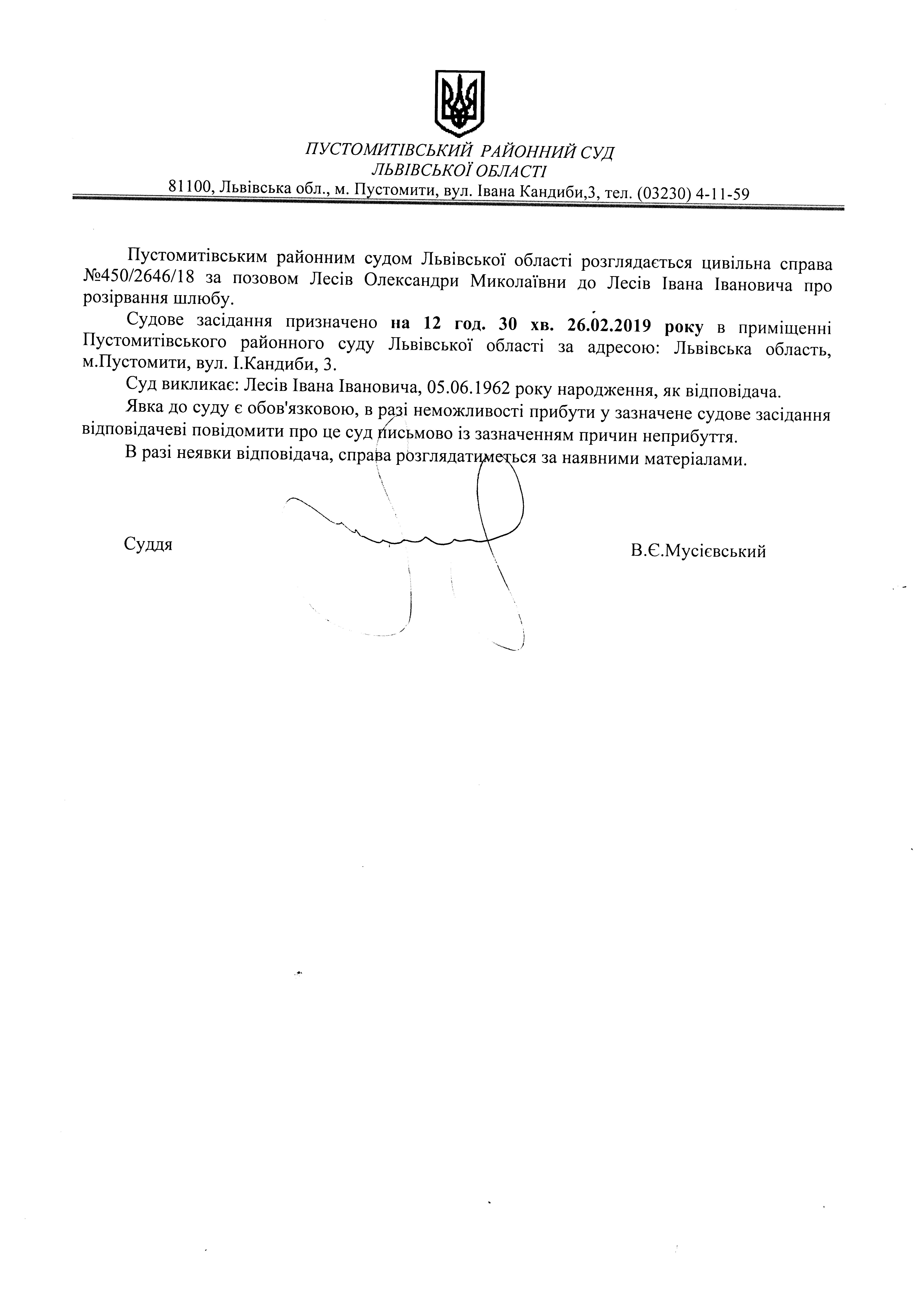 Оголошення про виклик відповідача - Лесів Івана Івановича