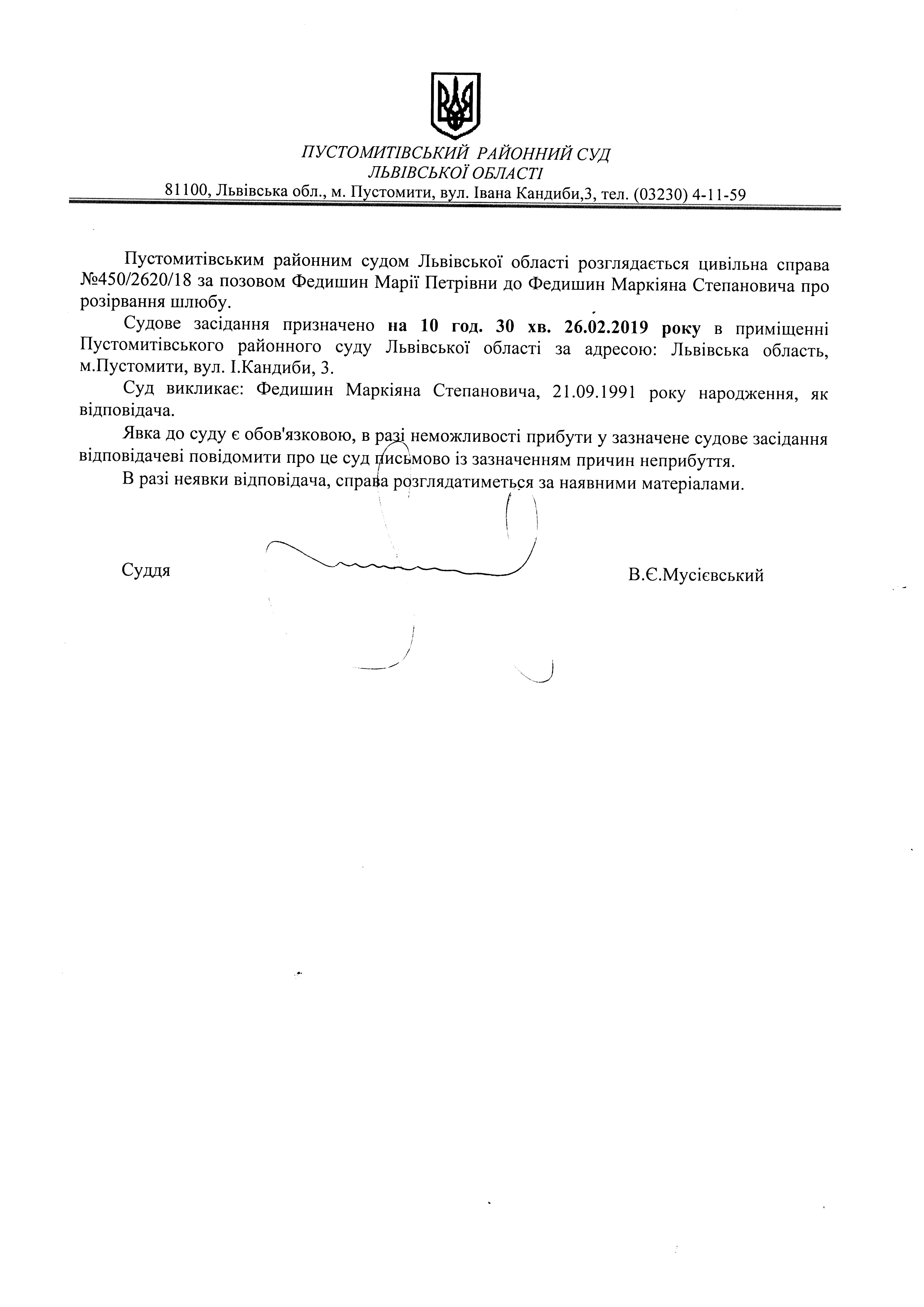 Оголошення про виклик відповідача - Федишина Маркіяна Степановича