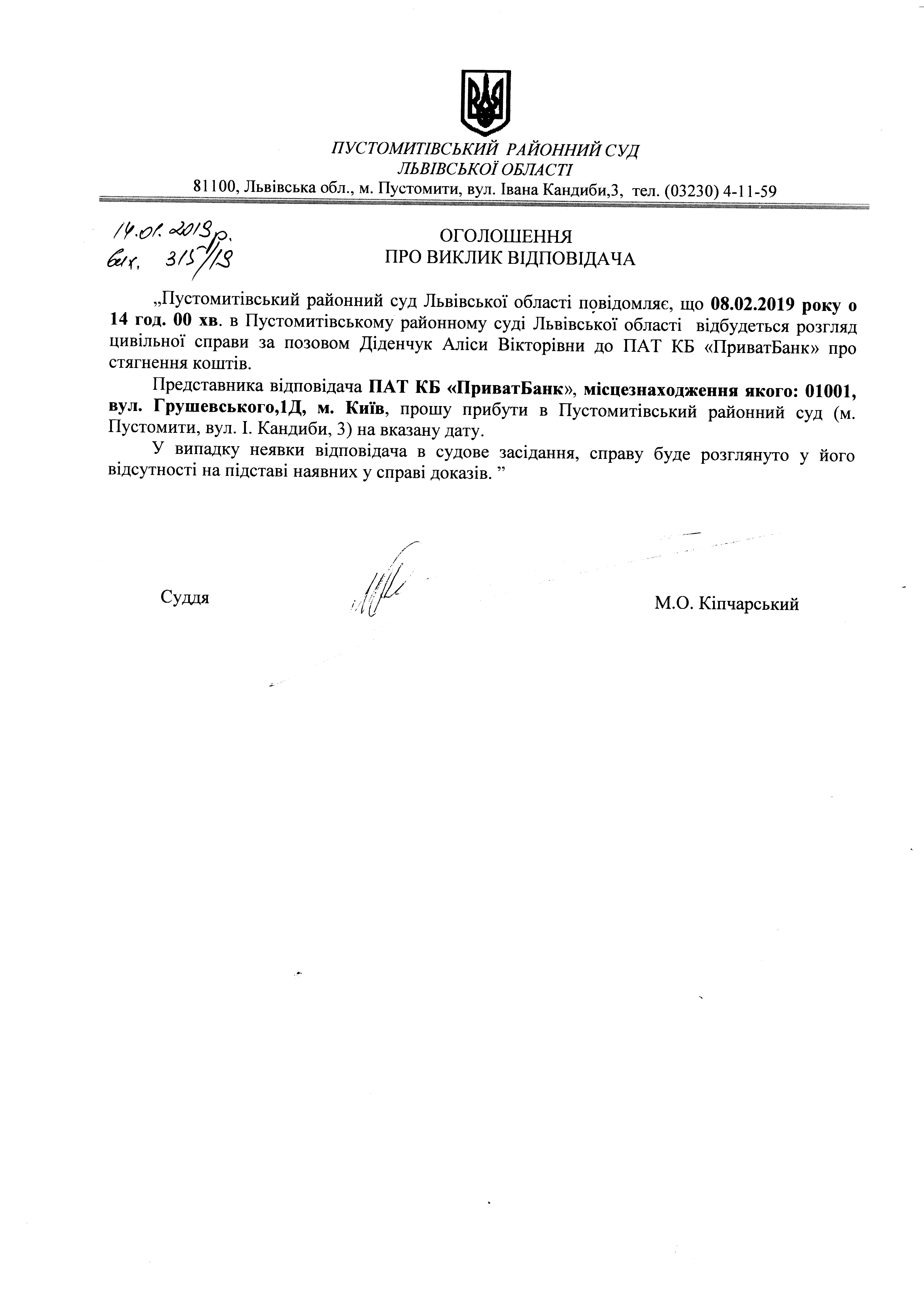 Оголошення про виклик представника відповідача - ПАТ КБ "ПриватБанк"