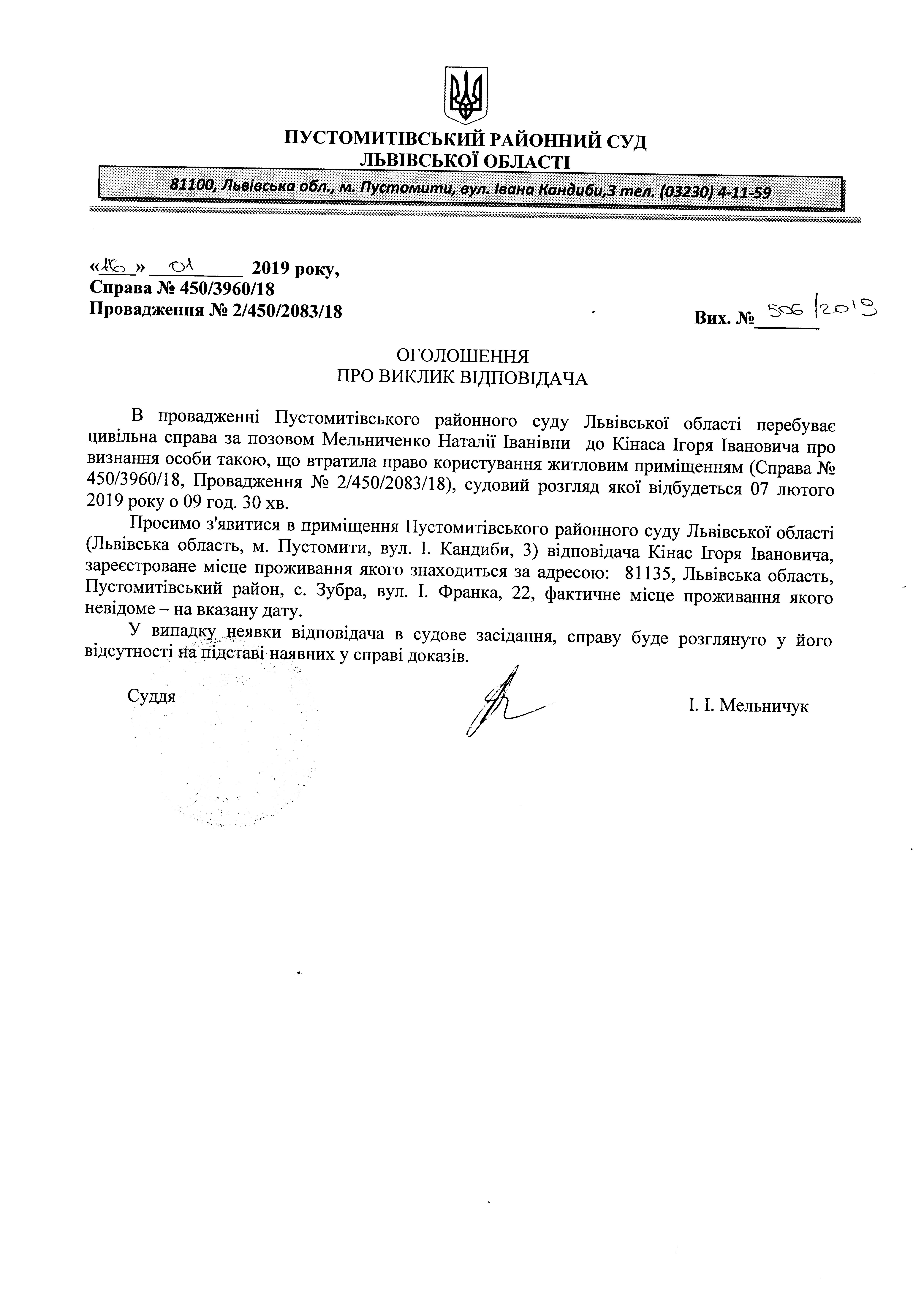 Оголошення про виклик відповідача - Кінас Ігоря Івановича