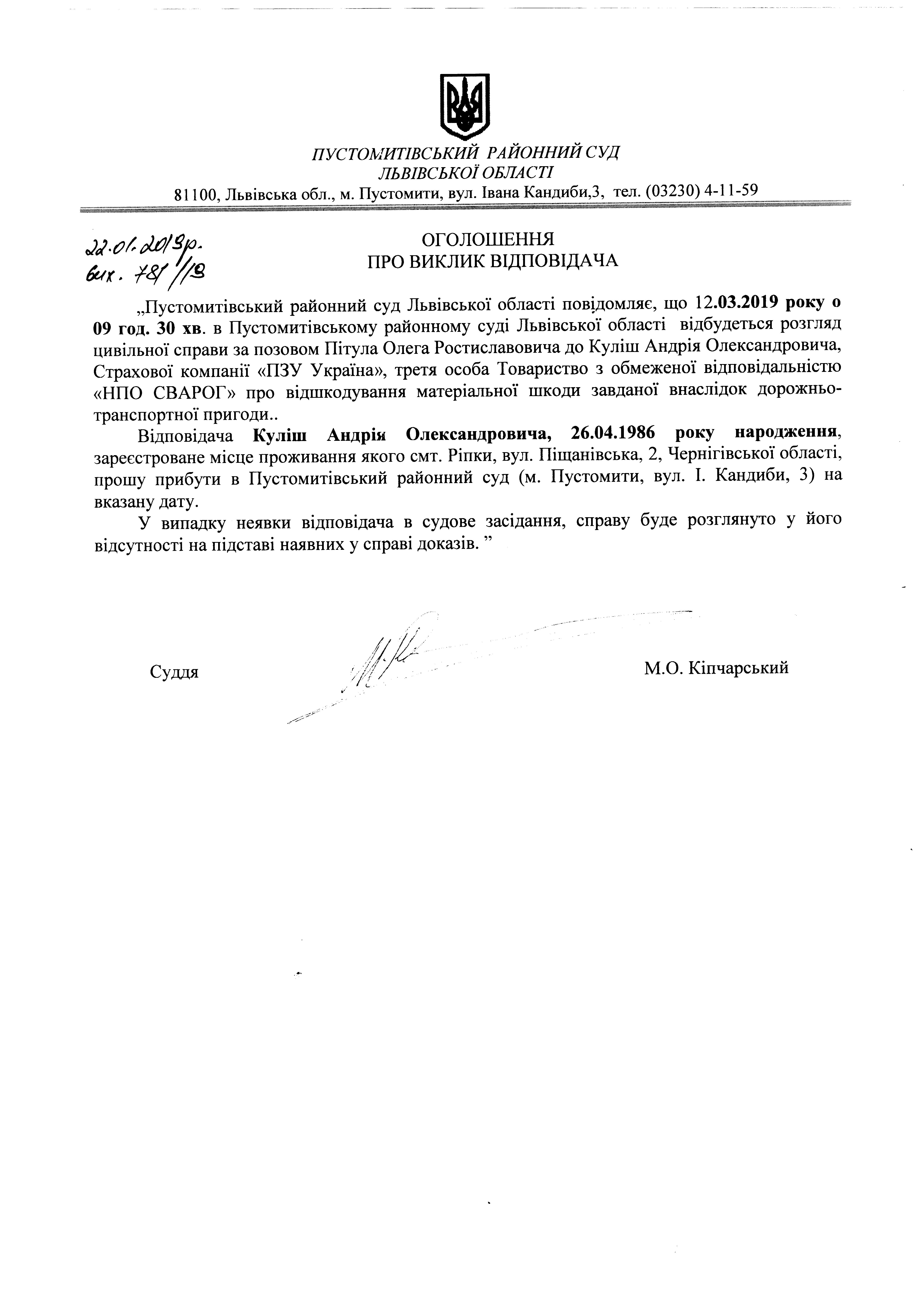 Оголошення про виклик відповідача - Куліша Андрія олександровича