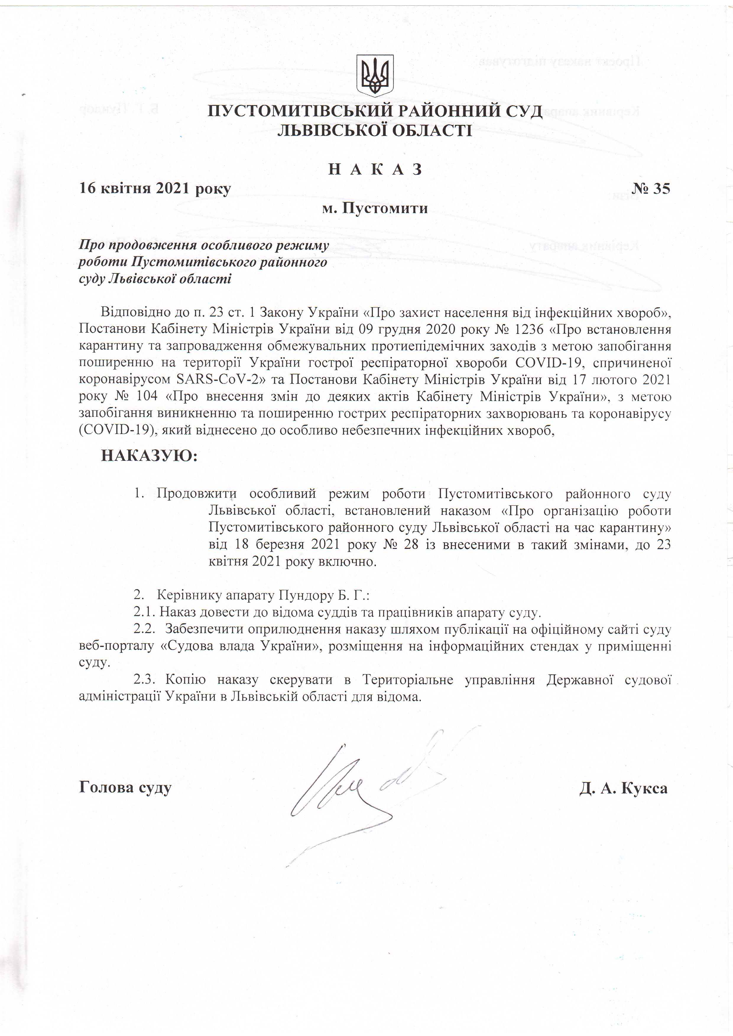 З метою запобігання виникненню та поширенню коронавірусу COVID-19 та, у зв’язку із захворюванням на коронавірусну інфекцію великої кількості працівників суду, згідно наказу голови суду № 35 від 16.04.2021 року Пустомитівський районний суд Львівської області до 23 квітня 2021 року запроваджує особливий режим роботи.