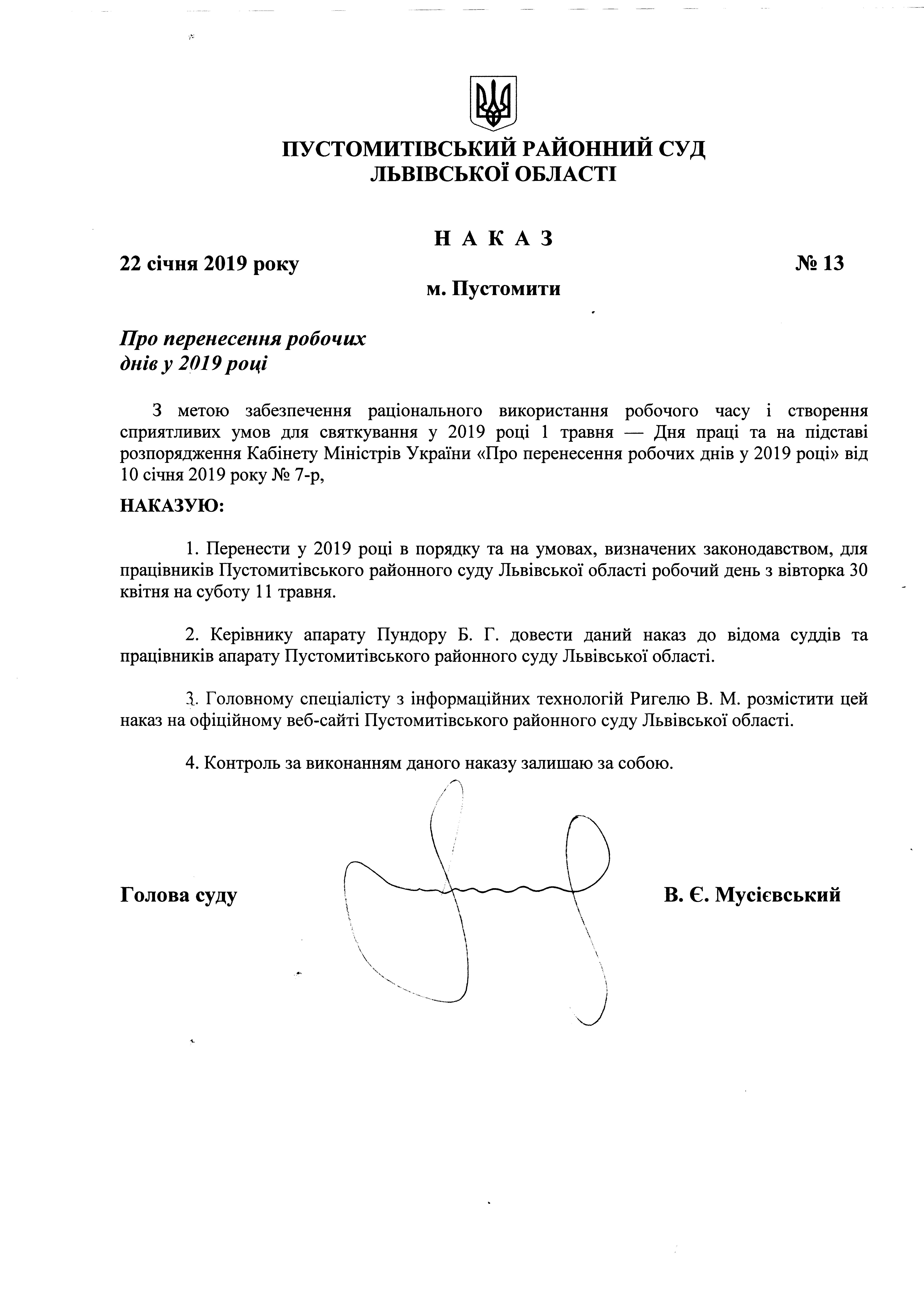 Відповідно до Розпорядження Кабінету Міністрів України від 10 січня 2019 року № 7 "Про перенесення робочих днів у 2019 році" та наказу голови Пустомитівського районного суду Львівської області від 22 січня 2019 року № 13 "Про перенесення робочих днів у 2019 році" робочий день переноситься: