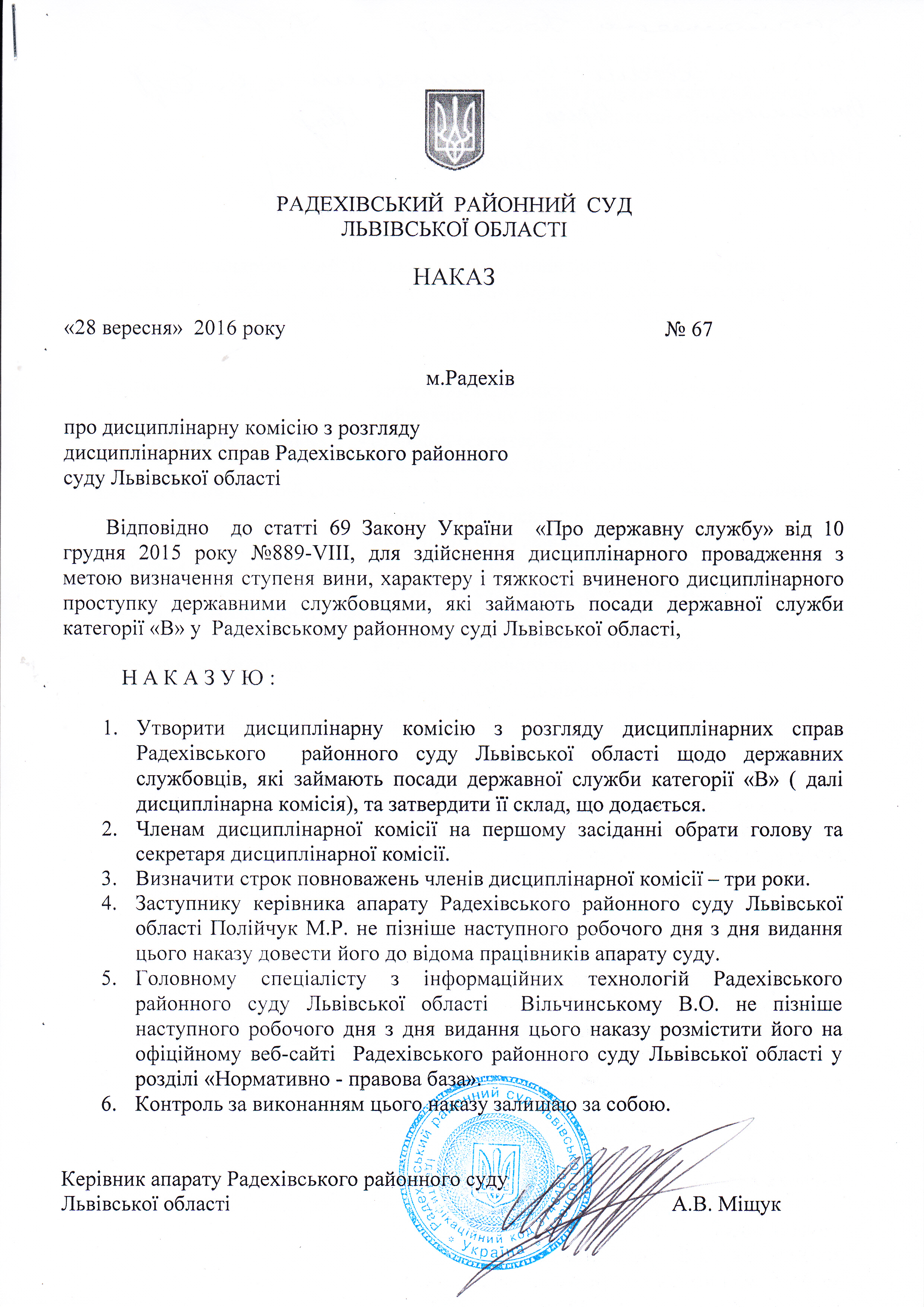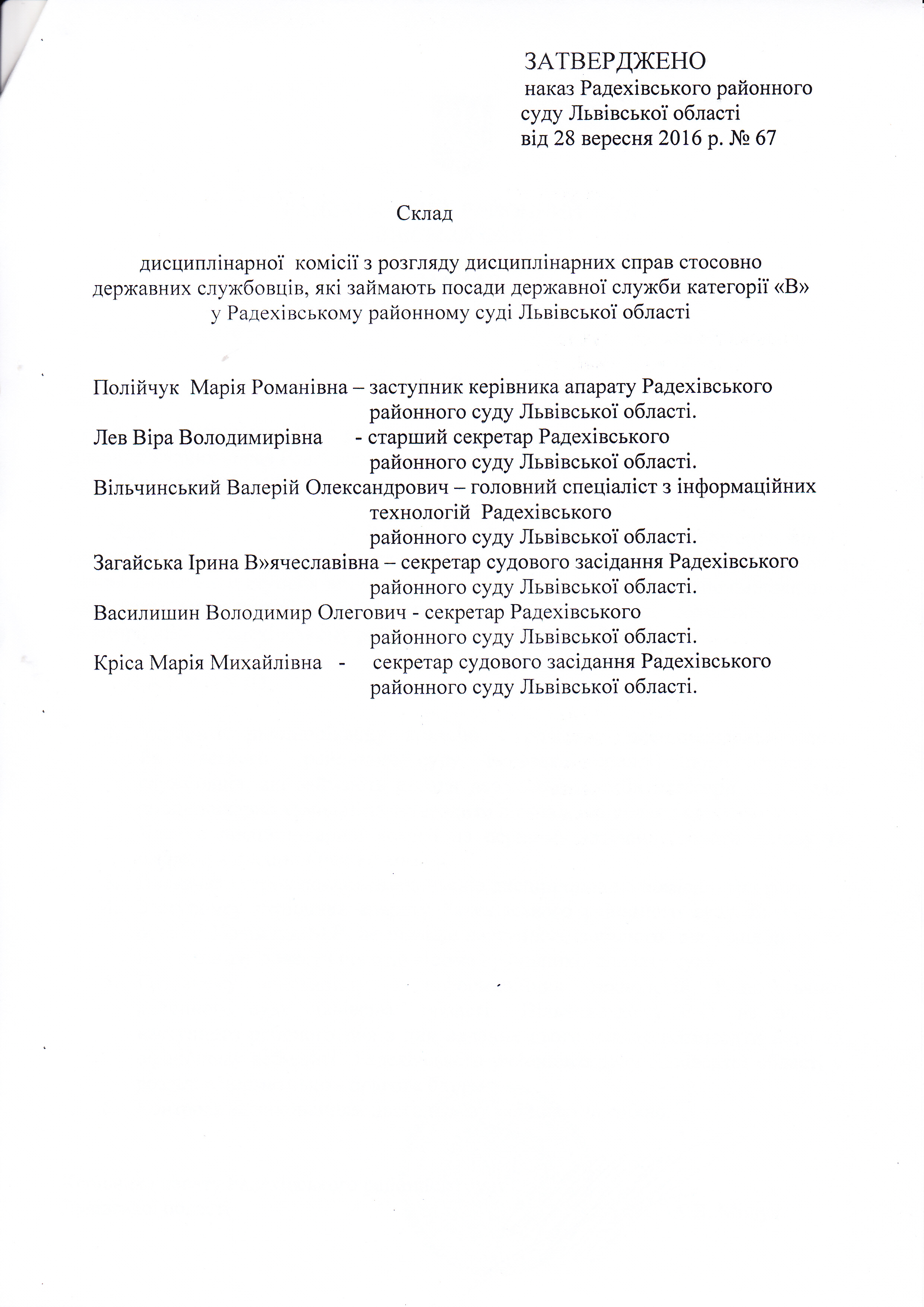 Наказ Радехівського районного суду Л/о від 28 вересня 2016 року "Про дисциплінарну комісію з розгляду дисциплінарних справ Радехівського районного суду Львівської області"