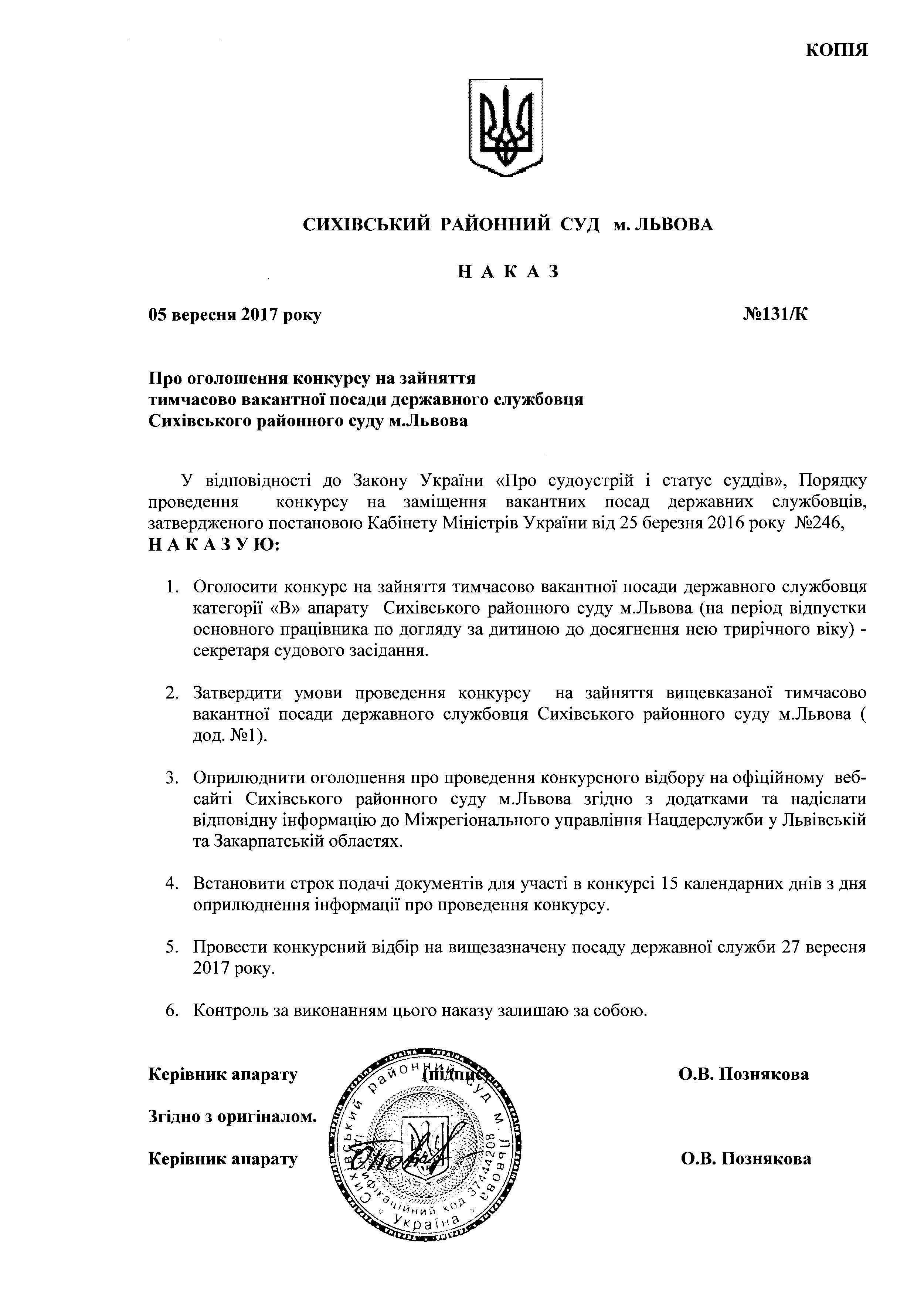 Оголошено конкурс на заміщення тимчасово вакантної посади державного службовця - секретаря судового засідання