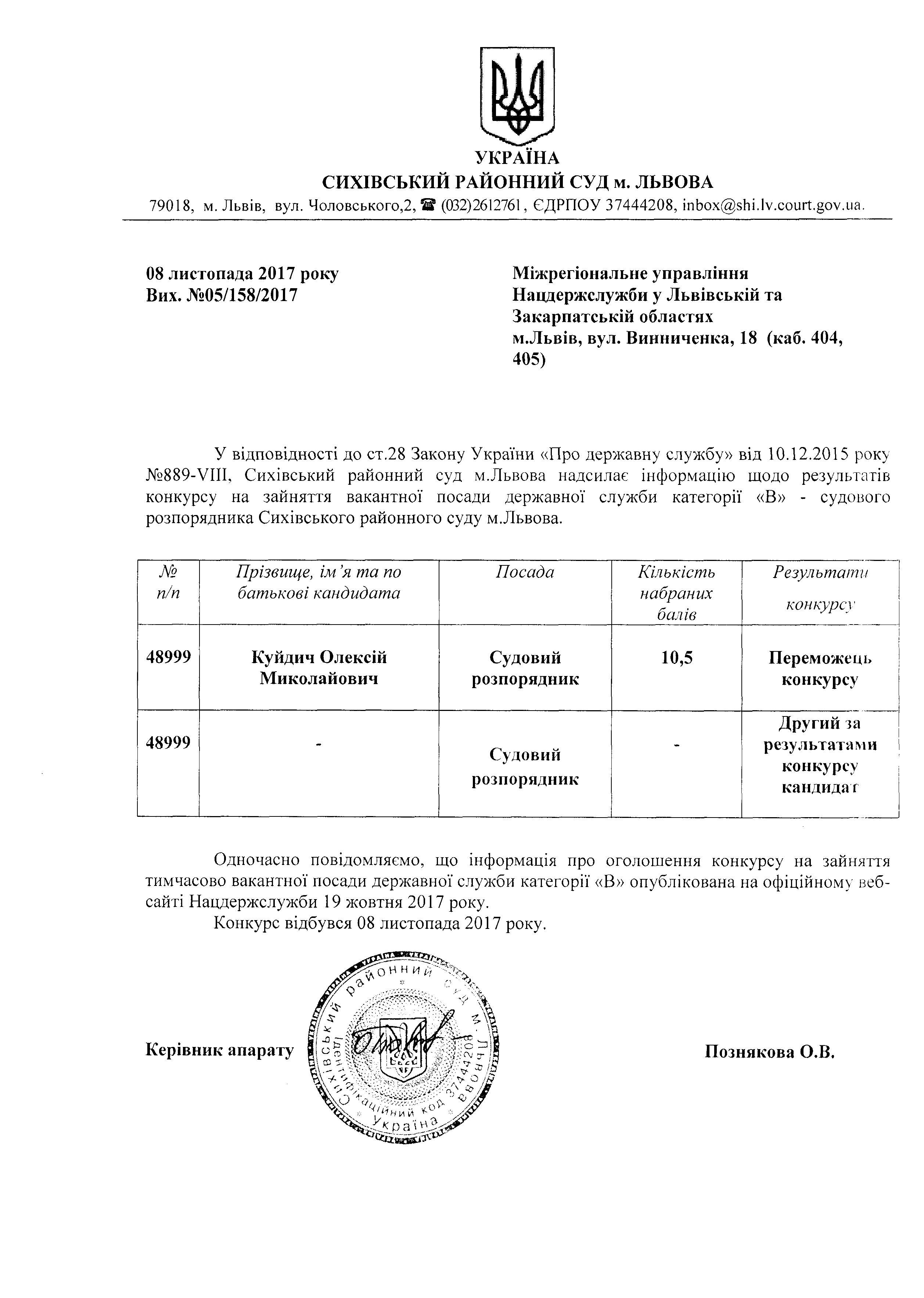 Результати проведення конкурсу на зайняття тимчасово вакантної посади Сихівського районного суду м.Львова