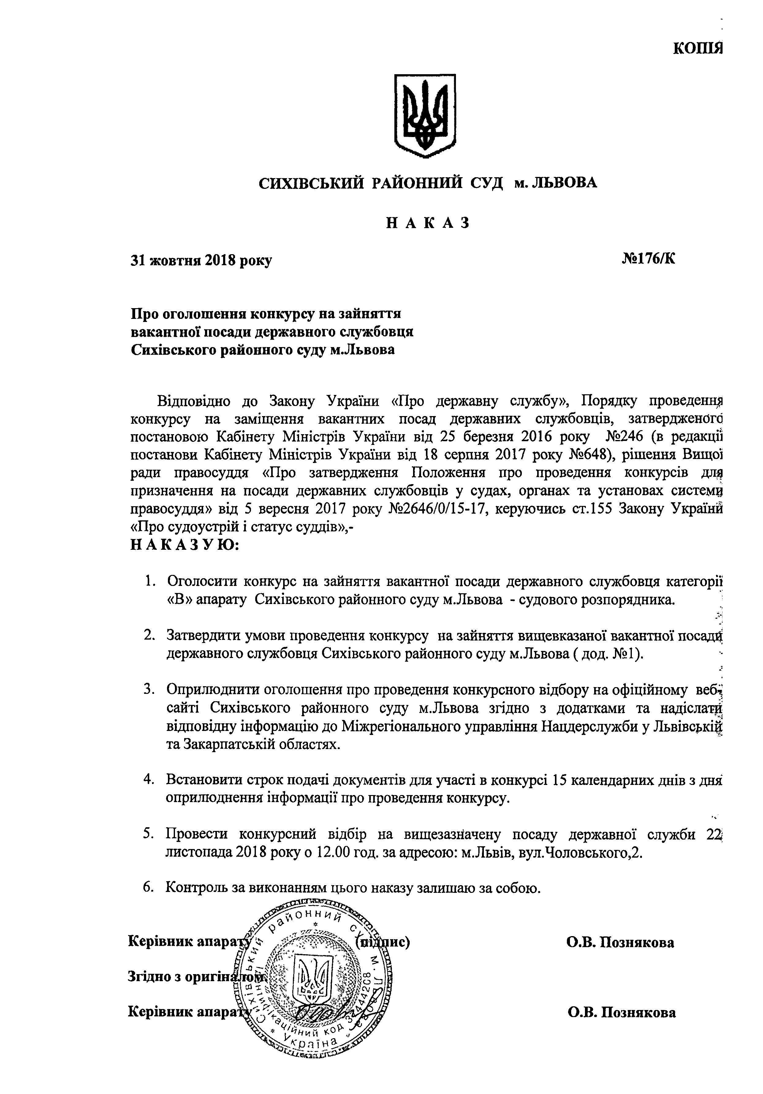 Умови проведення конкурсу на зайняття вакантної посади державної служби категорії «В» - судового розпорядника.