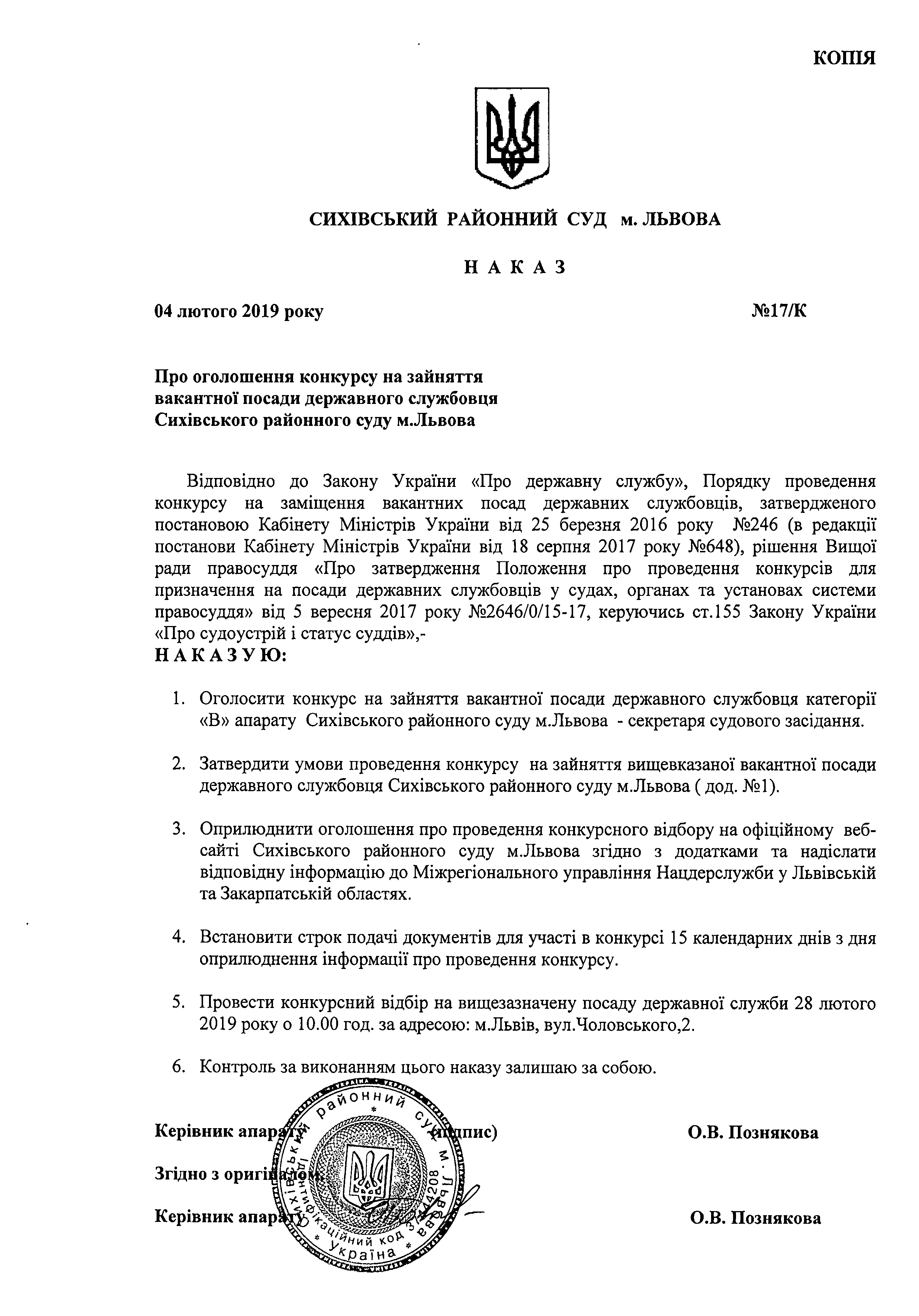Оголошено конкурс на зайняття вакантної посади державного службовця - секретаря судового засідання