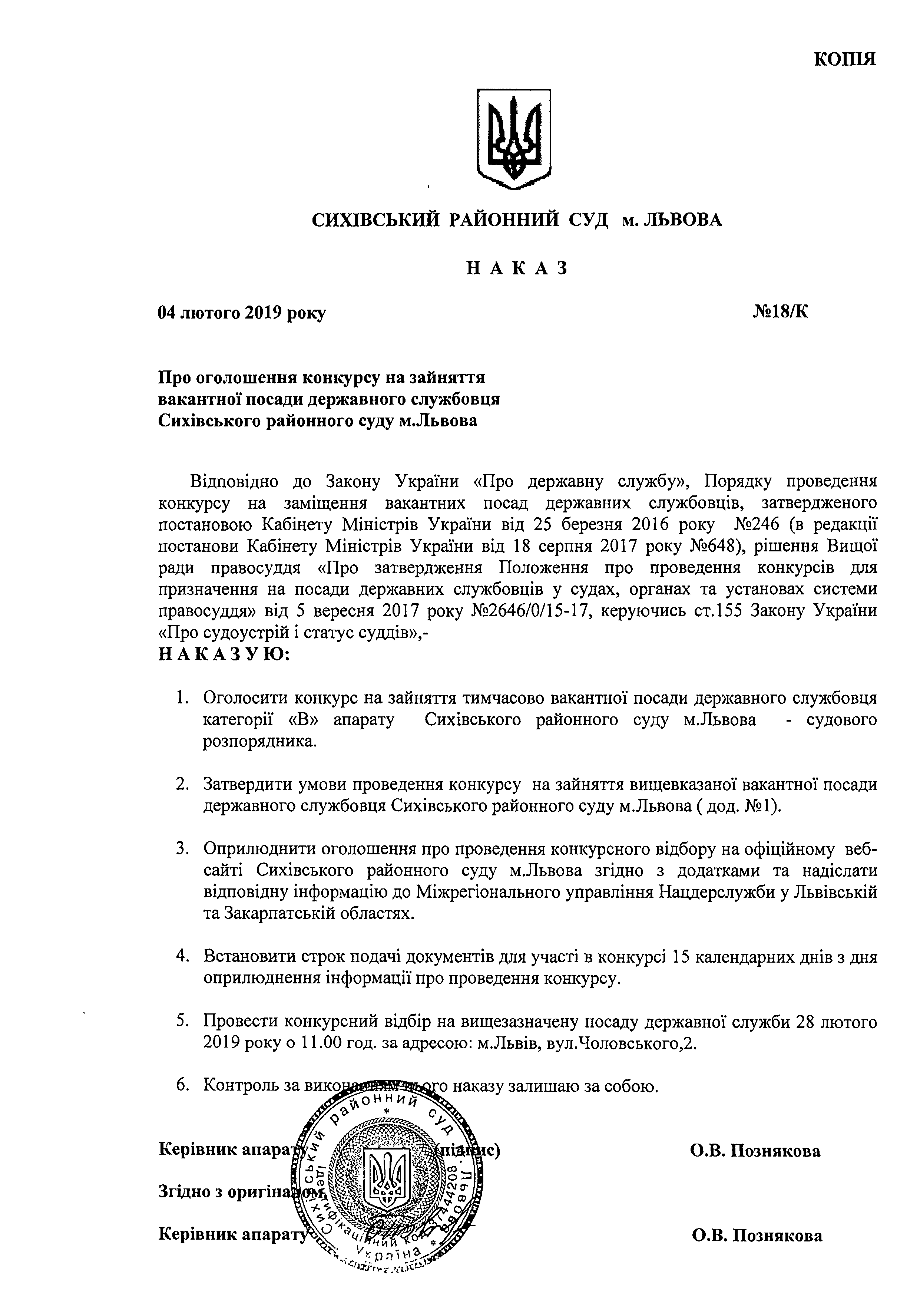 Оголошено конкурс на зайняття вакантної посади державного службовця - судового розпорядника