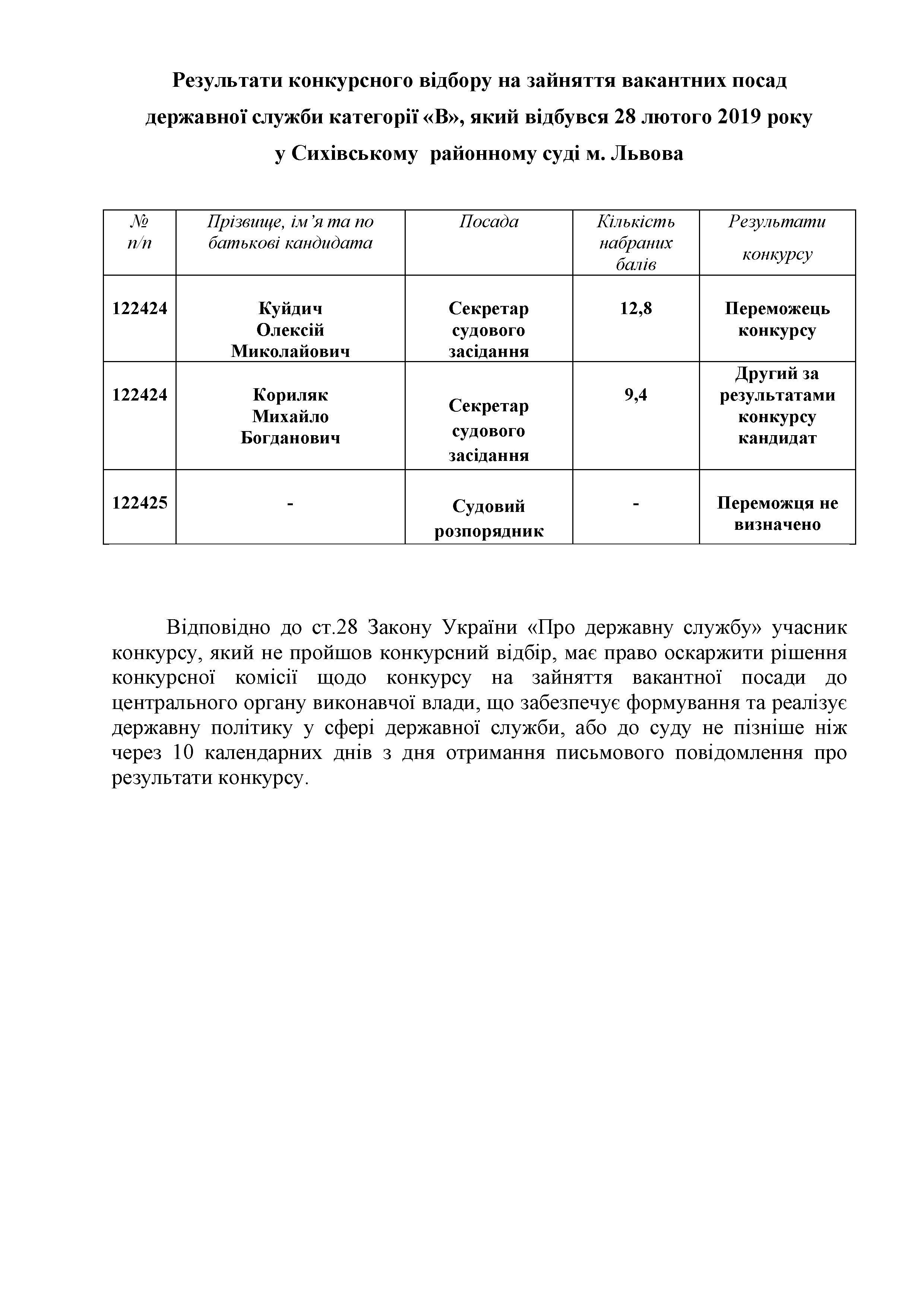 Результати конкурсного відбору на зайняття вакантних посад, який відбувся 28 лютого 2019 року