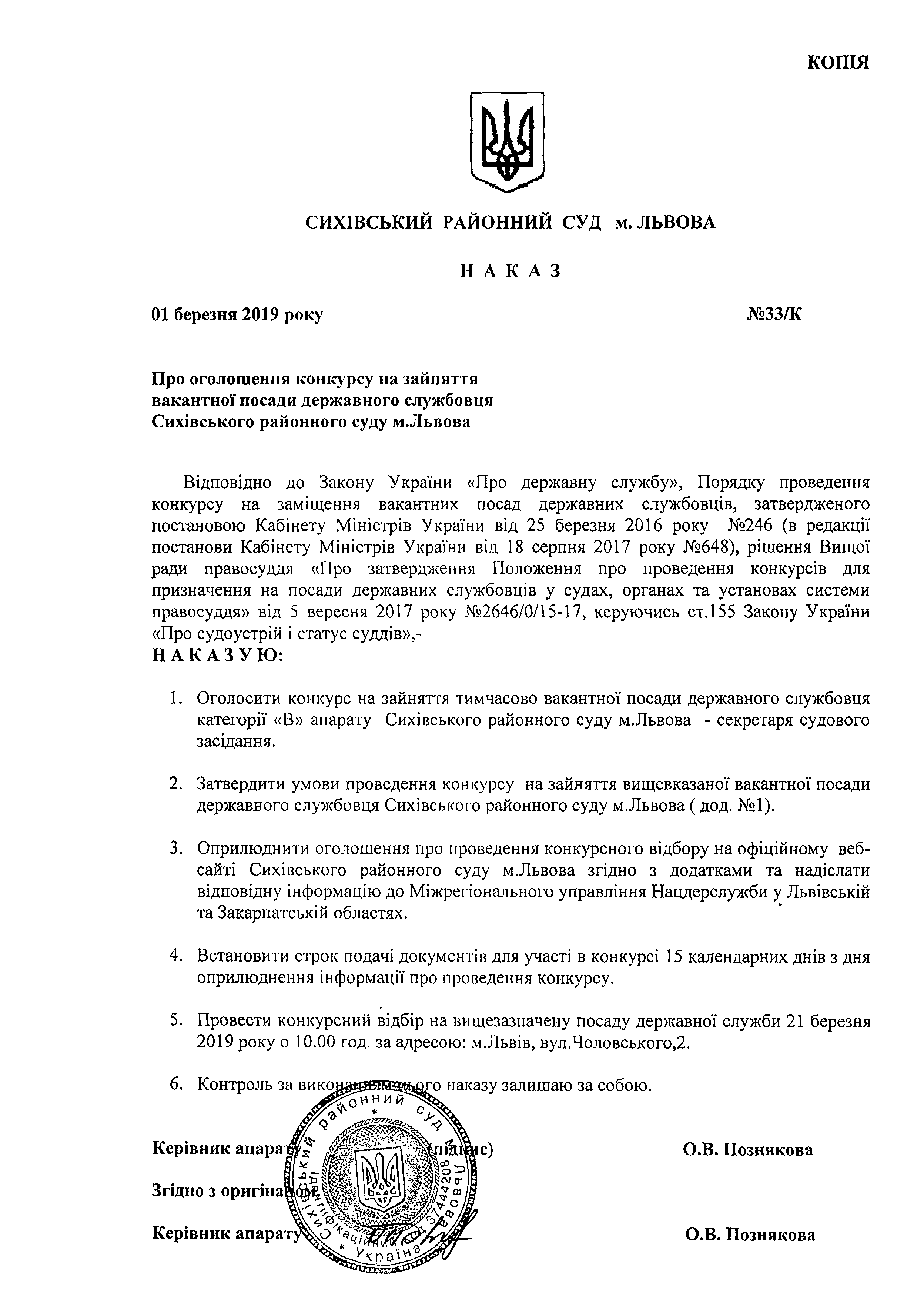 Оголошено конкурс на зайняття вакантної посади державного службовця - секретаря судового засідання